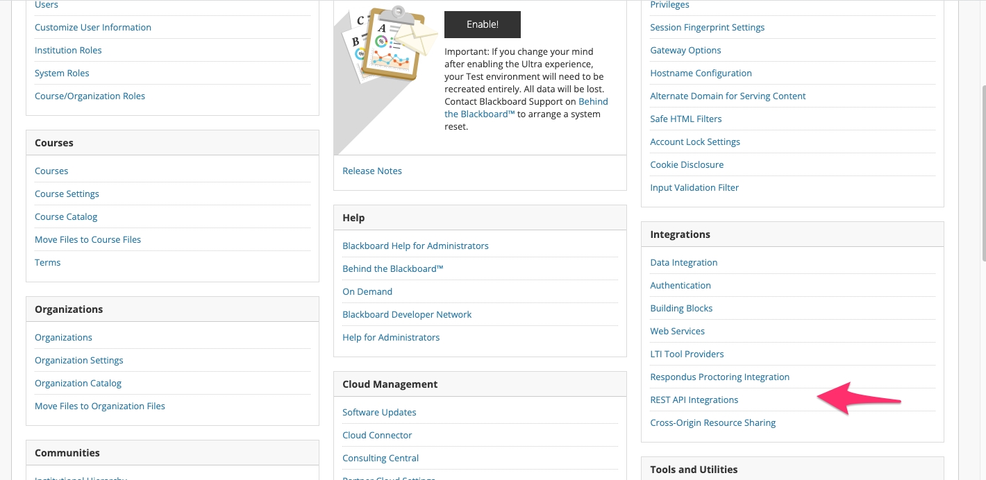 Log in with admin privileges, and go to the System Admin tab in the top menu. After that, look under Integrations for REST API Integrations: