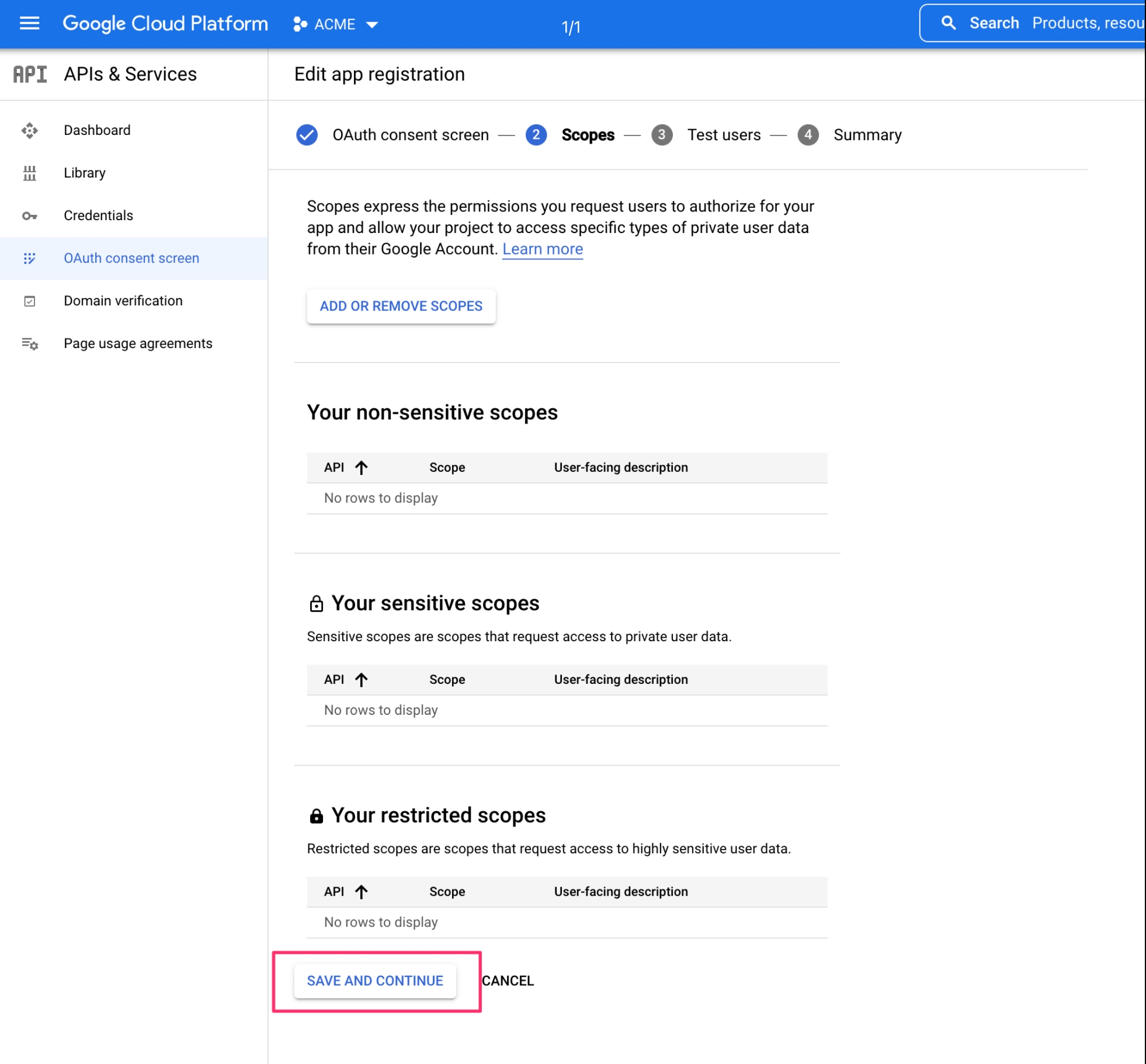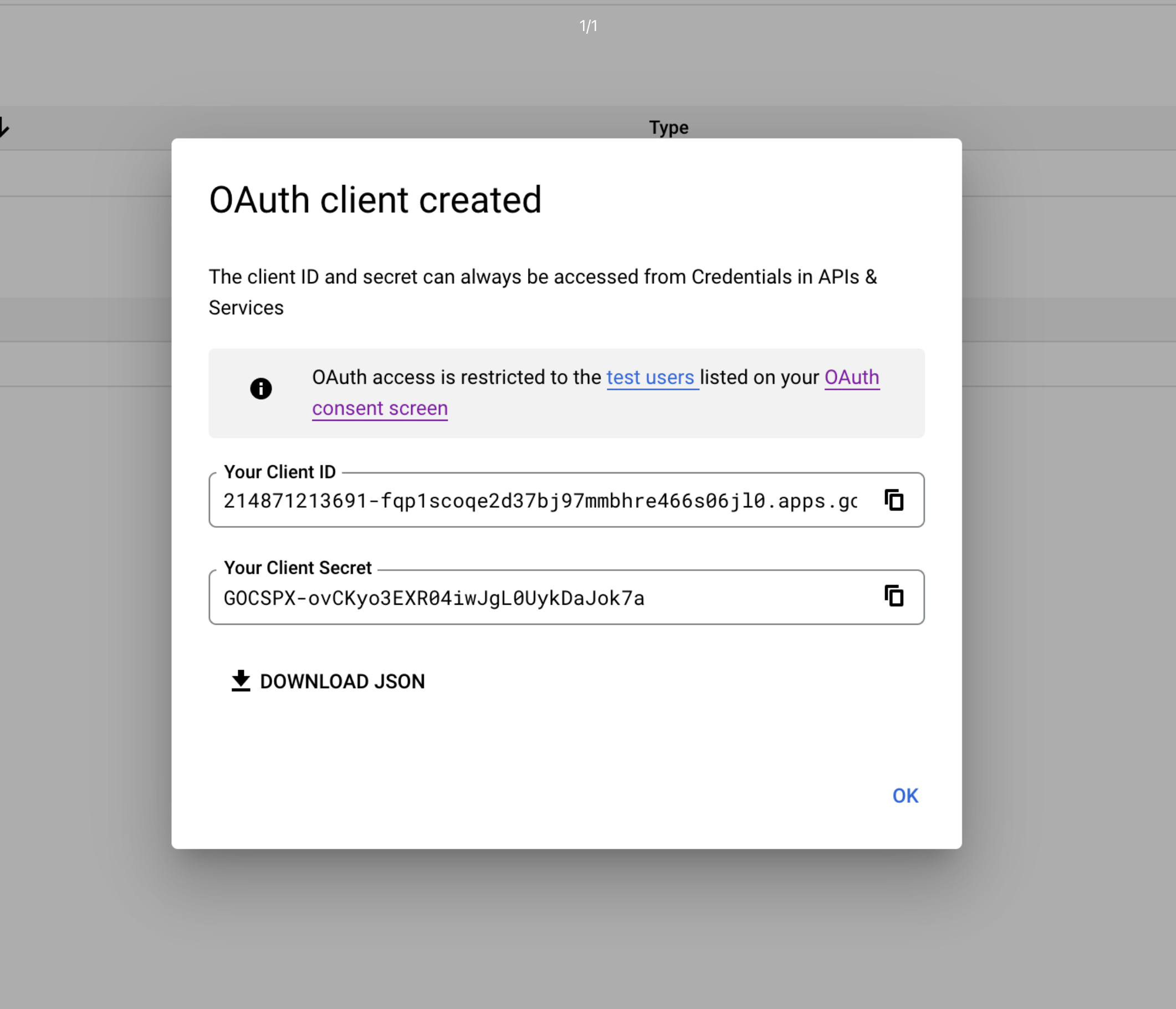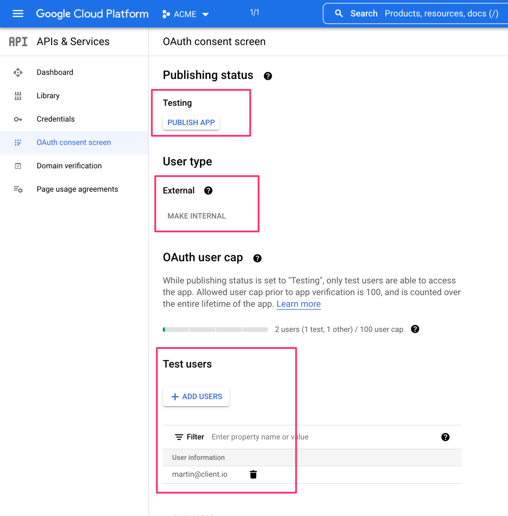 Here is the Oauth consent screen configured. The app is in the testing mode, it is external (for users outside your organization). No more than 100 accounts (user cap) can be used with this application.