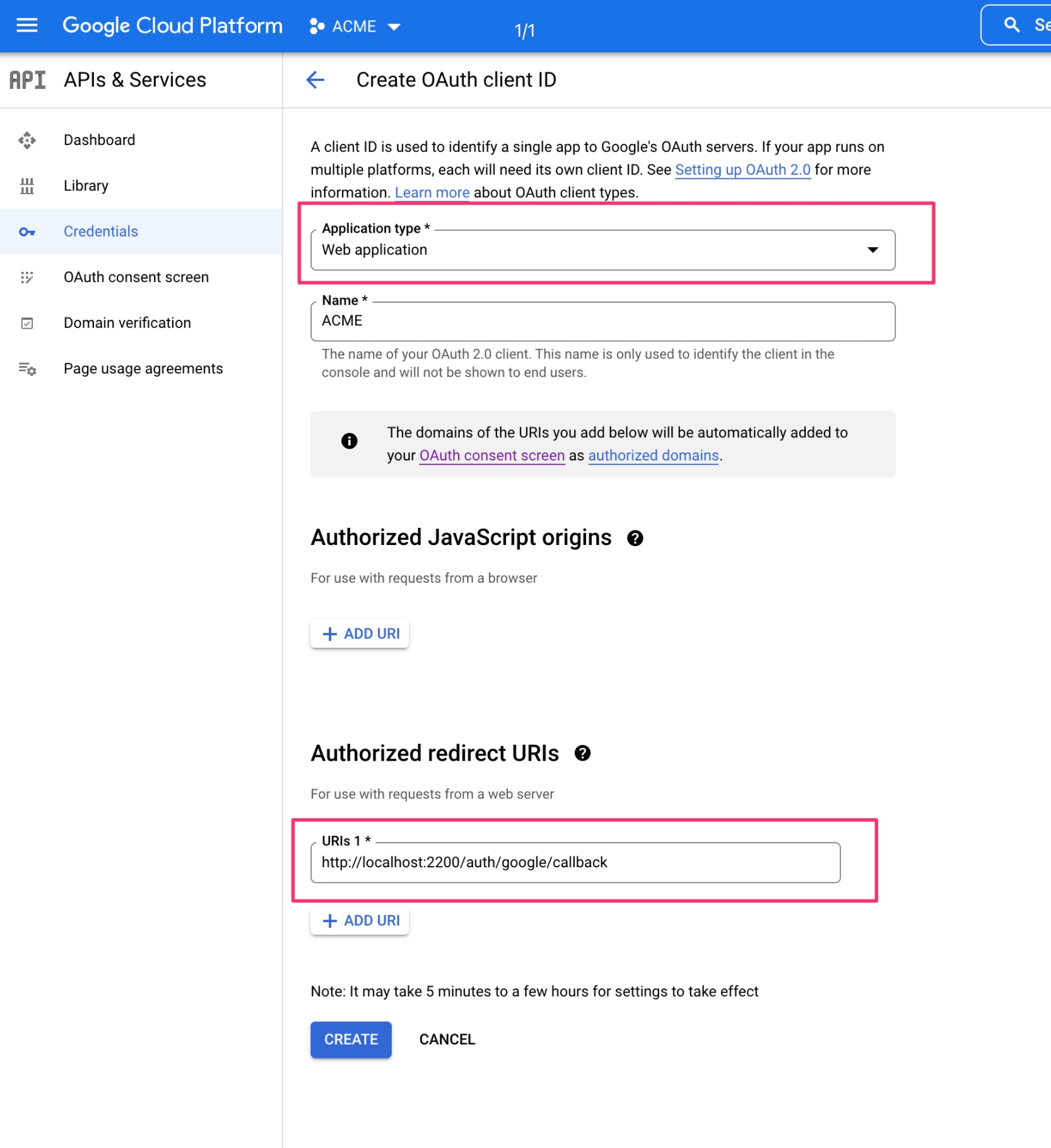For the purpose of this tutorial, we are going to use localhost:2200 which is the default port for the Appmixer API when running on localhost. If you are creating an Oauth application for your production/QA, the URI of your server will be here. The suffix /auth/google/callback will remain there.