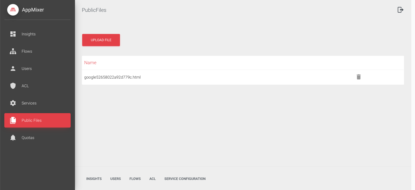 After you download your HTML verification file, upload it via the Appmixer Backoffice interface to the Public Files section on the left. When you are done you should see your file listed: