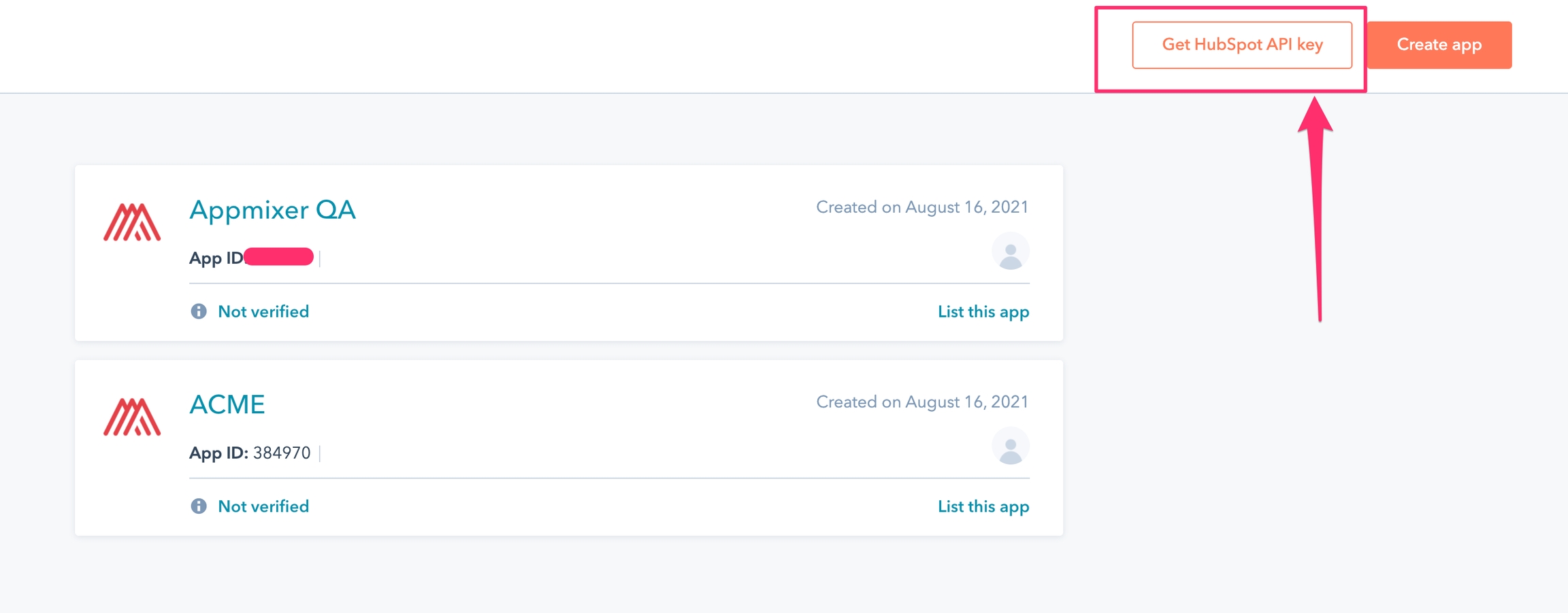 One more thing that you will need is the Hubspot, go back to the Apps page and hit the Get HubSpot API key button.