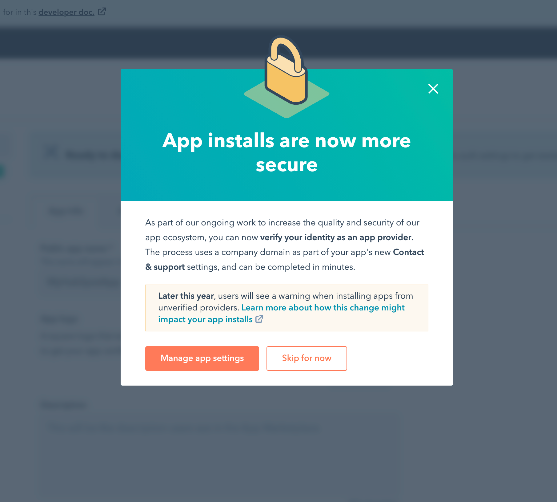 In order to get rid of a warning that your users will see before installing Hubspot module, you have to verify your identity as an app provider.