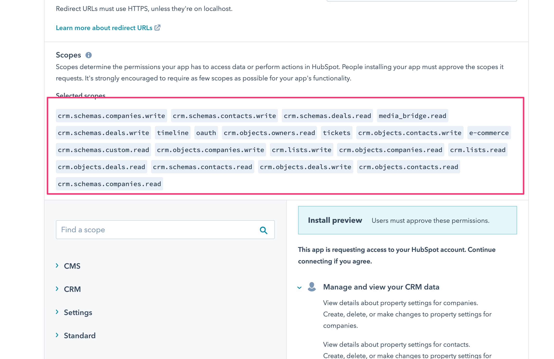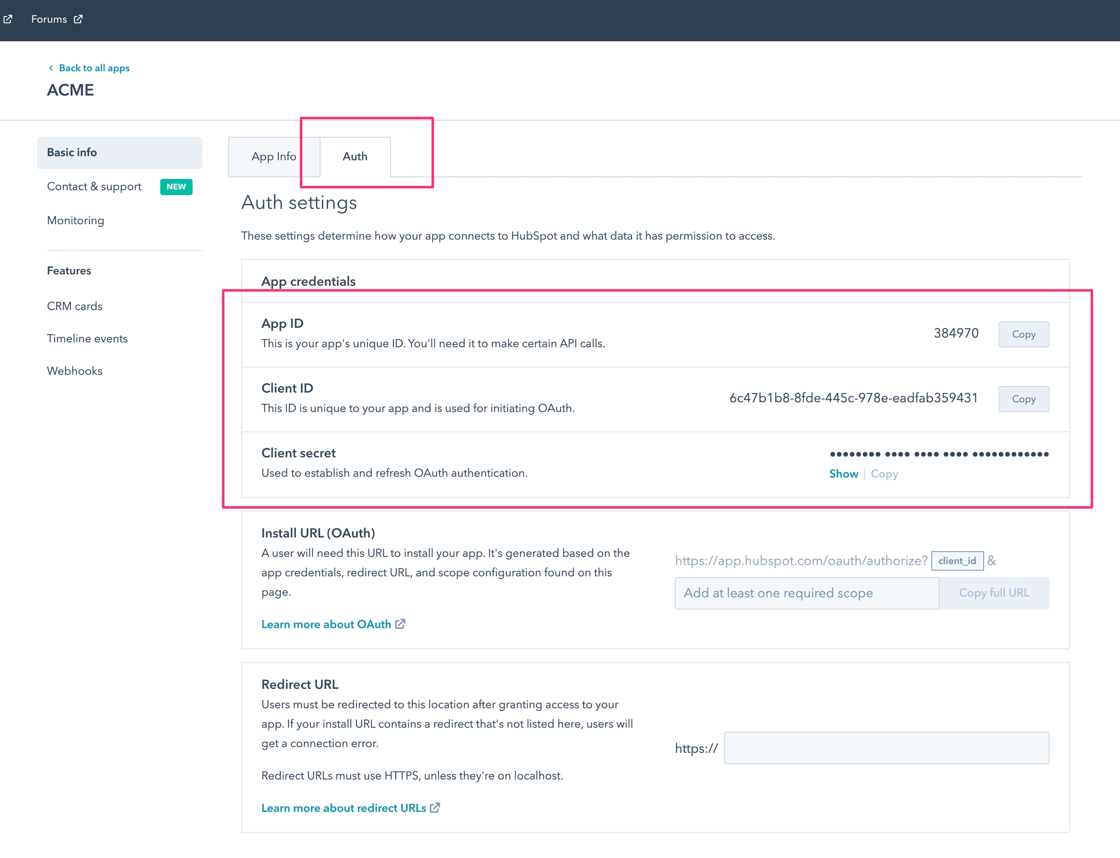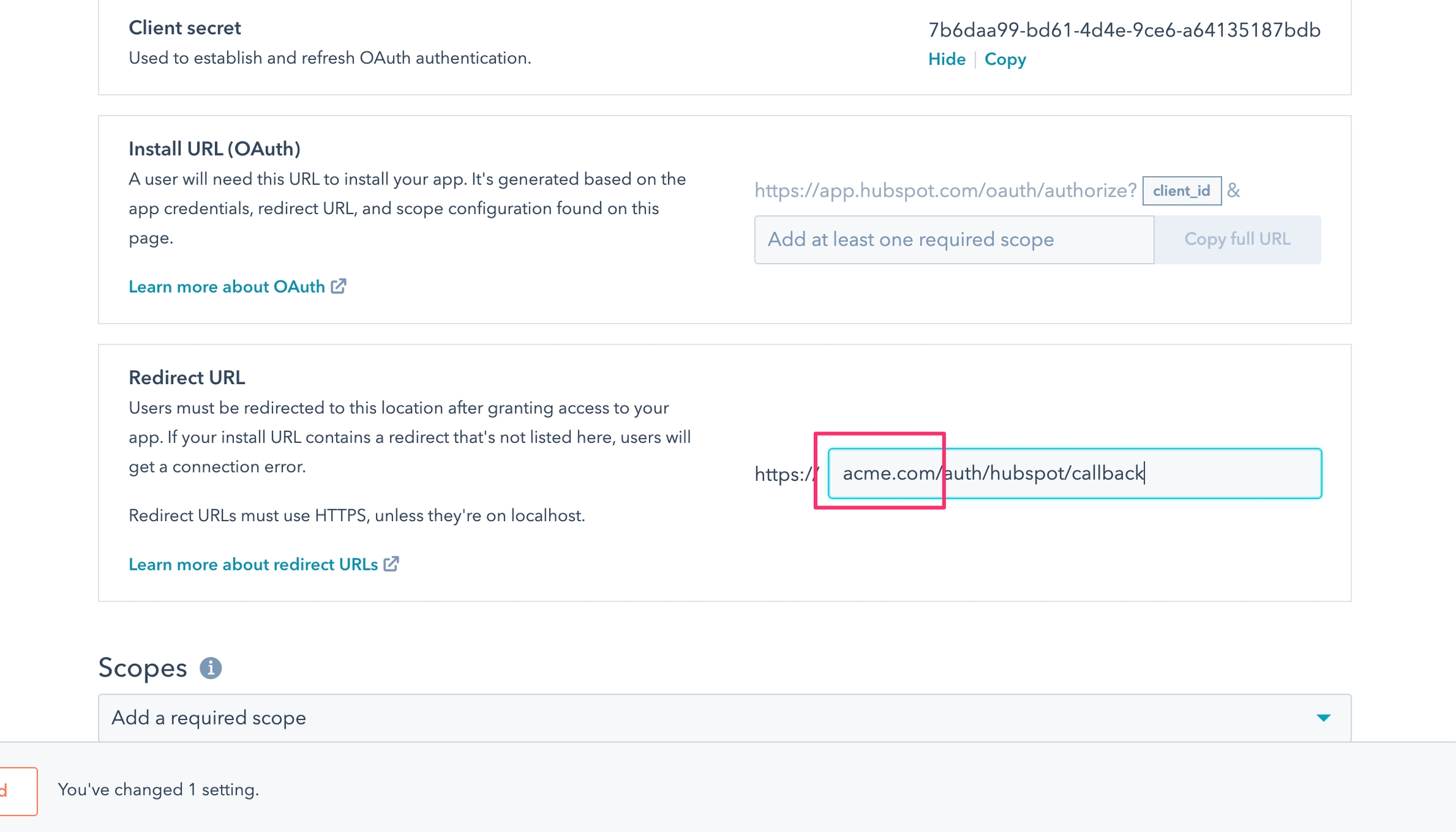 Go back to Hubspot and set the redirect URL, replace acme.com with your domain and keep the suffix /auth/hubspot/callback