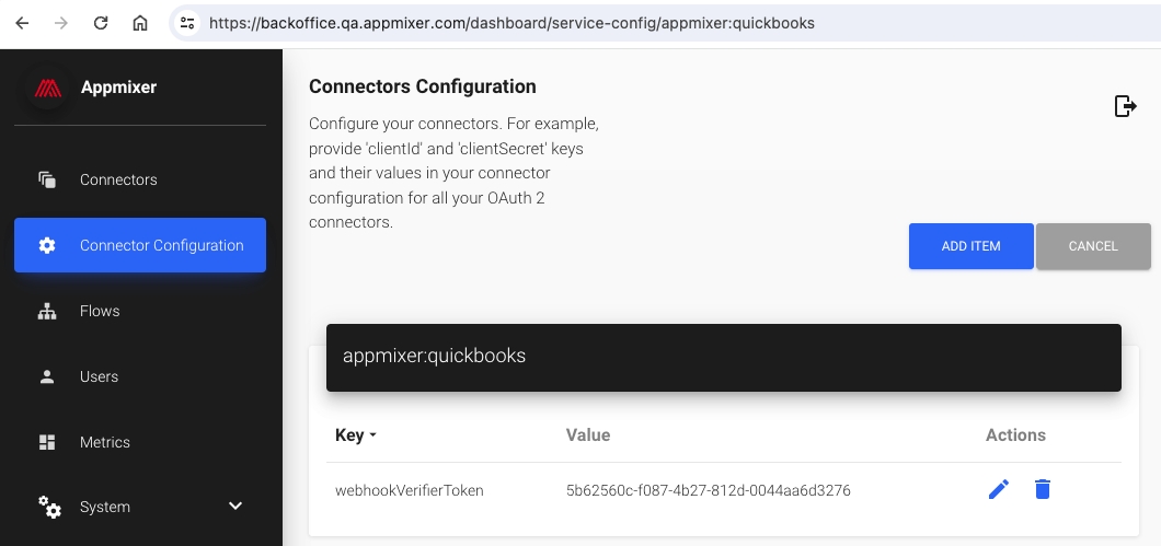 Make sure to copy the Verifier Token and paste it to the Appmixer BackOffice -> Configuration -> appmixer:quickbooks