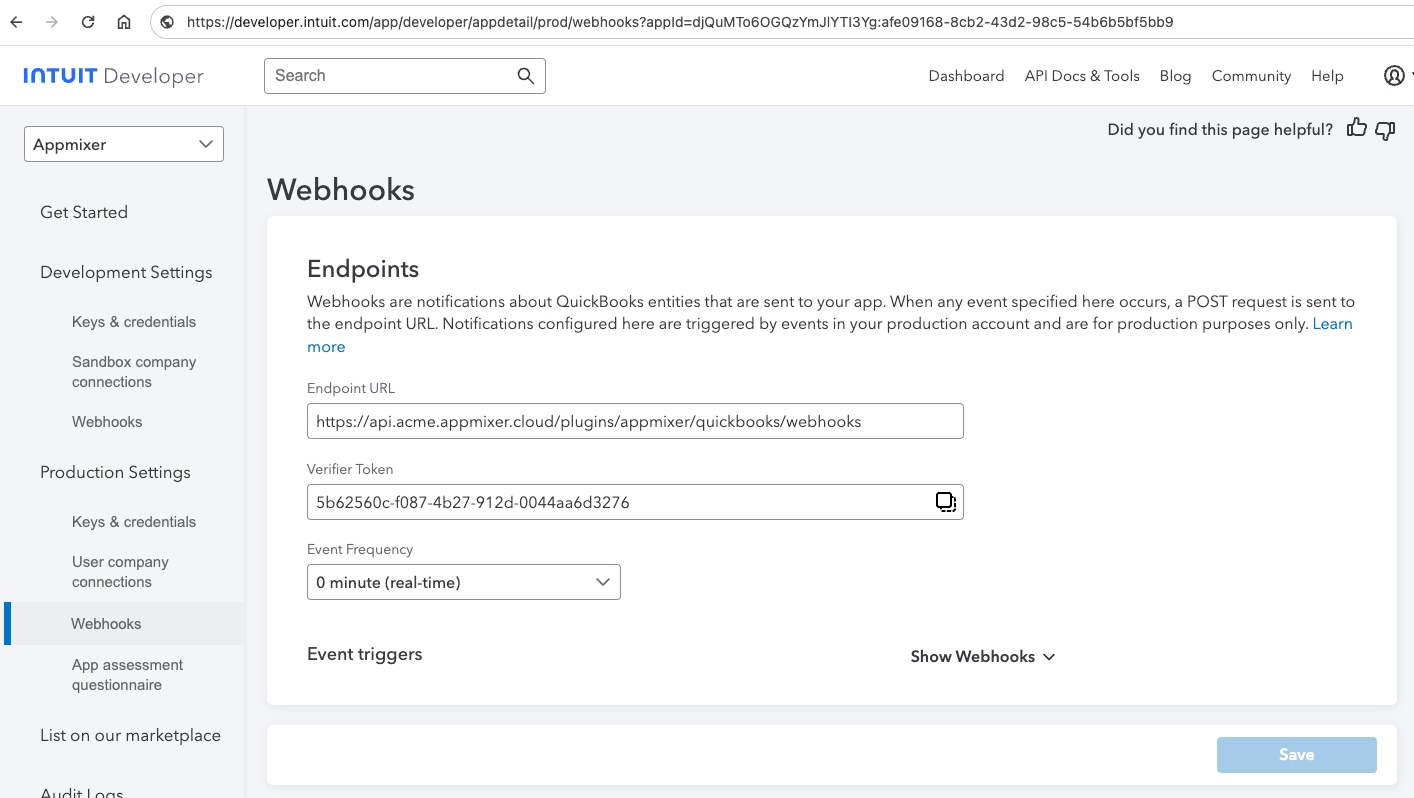 Go to https://developer.intuit.com/app/developer/dashboard then choose your Appmixer app. Navigate to the "Webhooks" section either for the sandbox or production environment and add a new webhook.