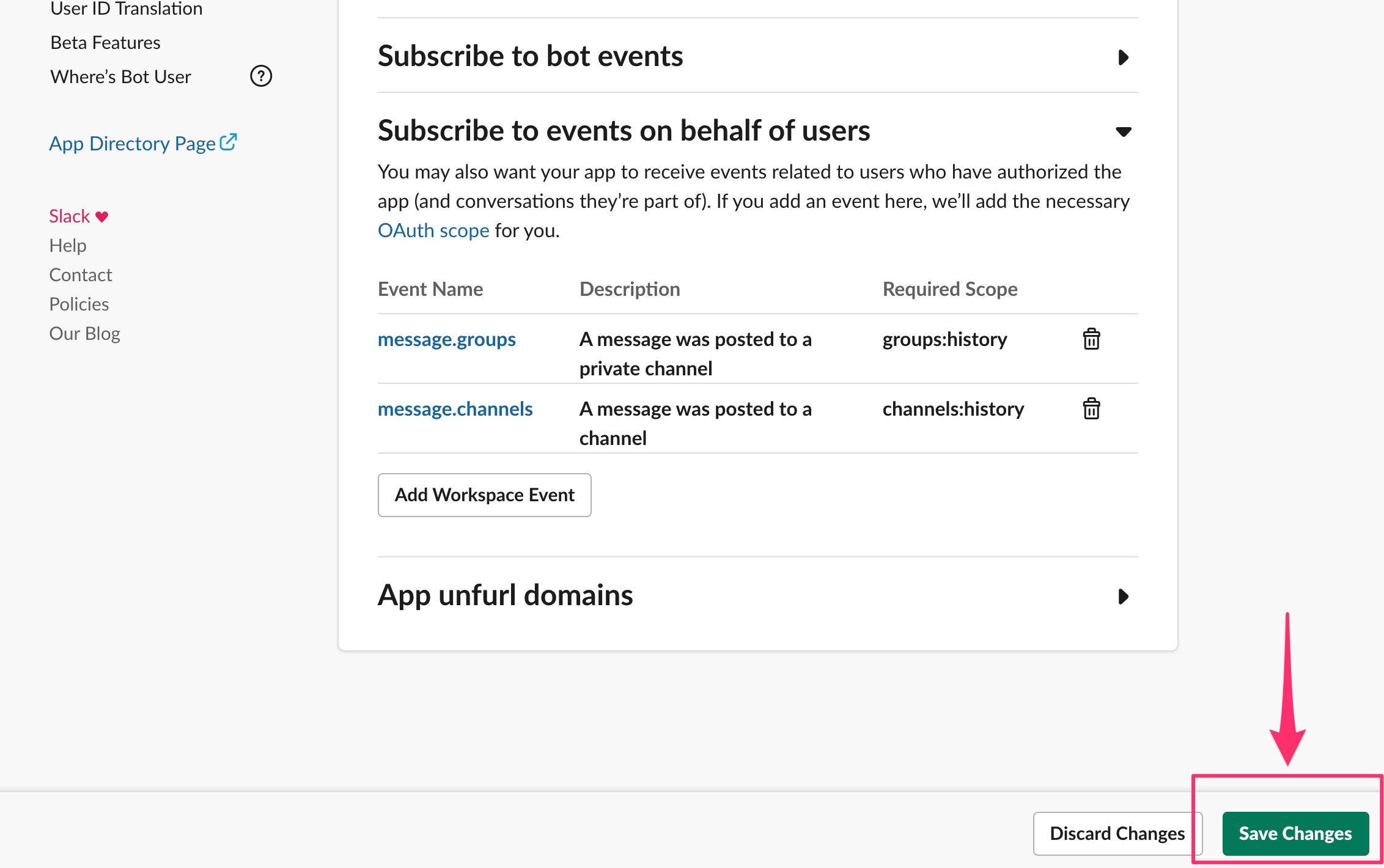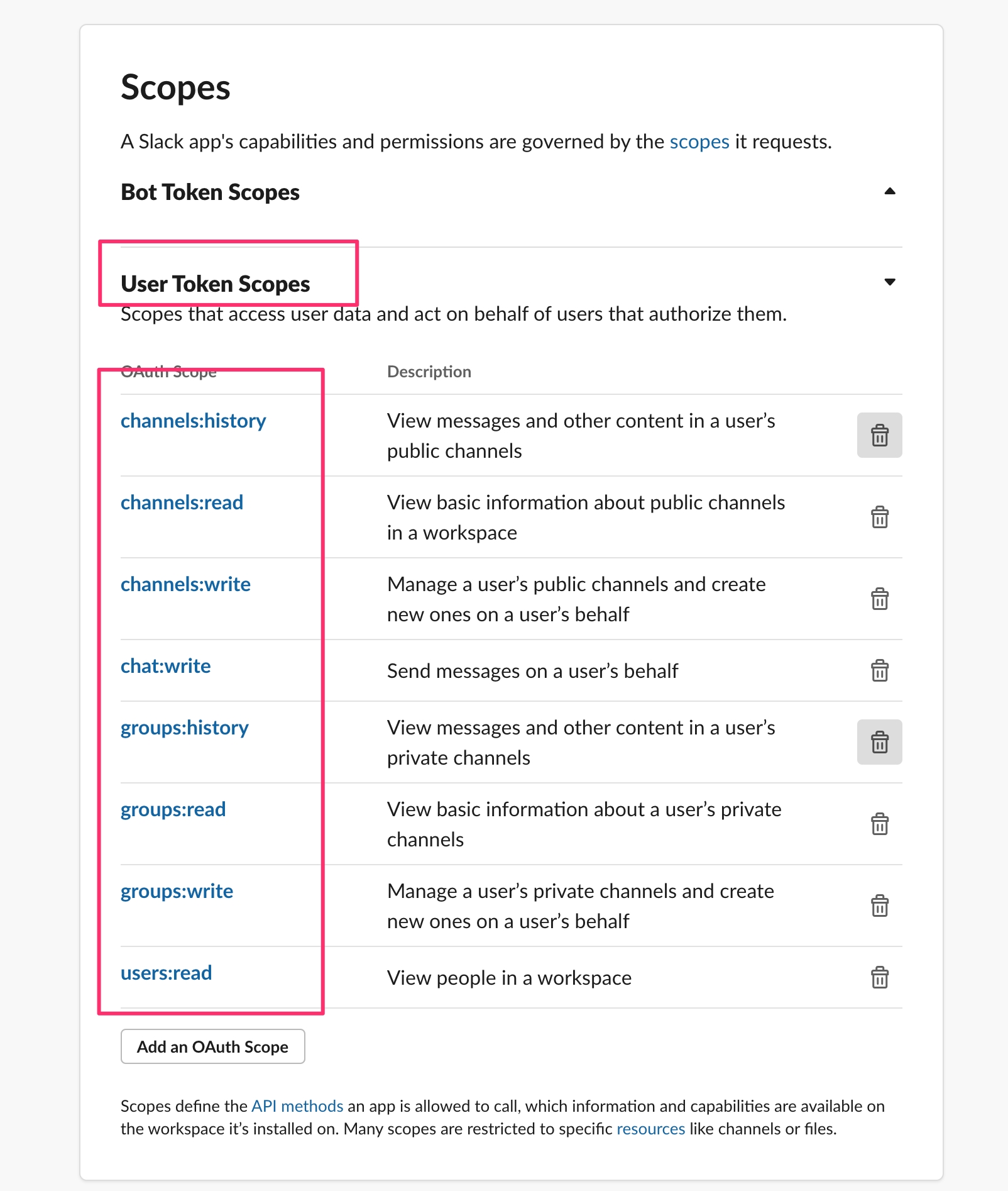 Select channels:read, channels:history, channels:write, groups:read, groups:write, groups:history, chat:write and users:read.
