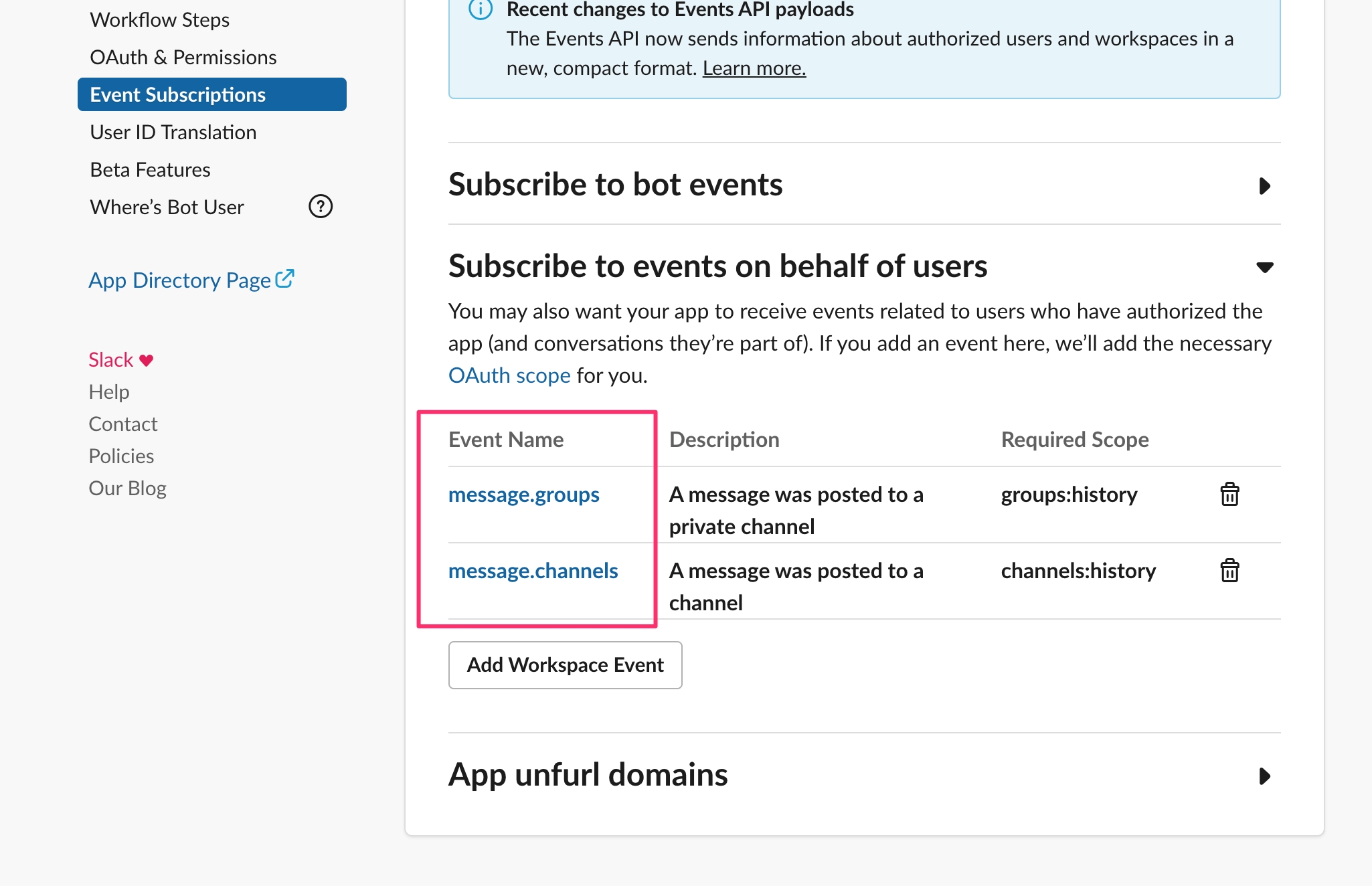 Go to your app settings (https://api.slack.com/apps/{your-app-id}/event-subscriptions)