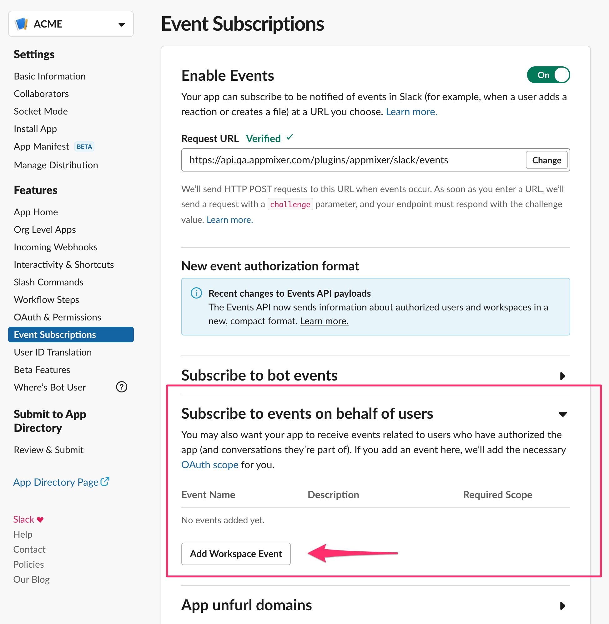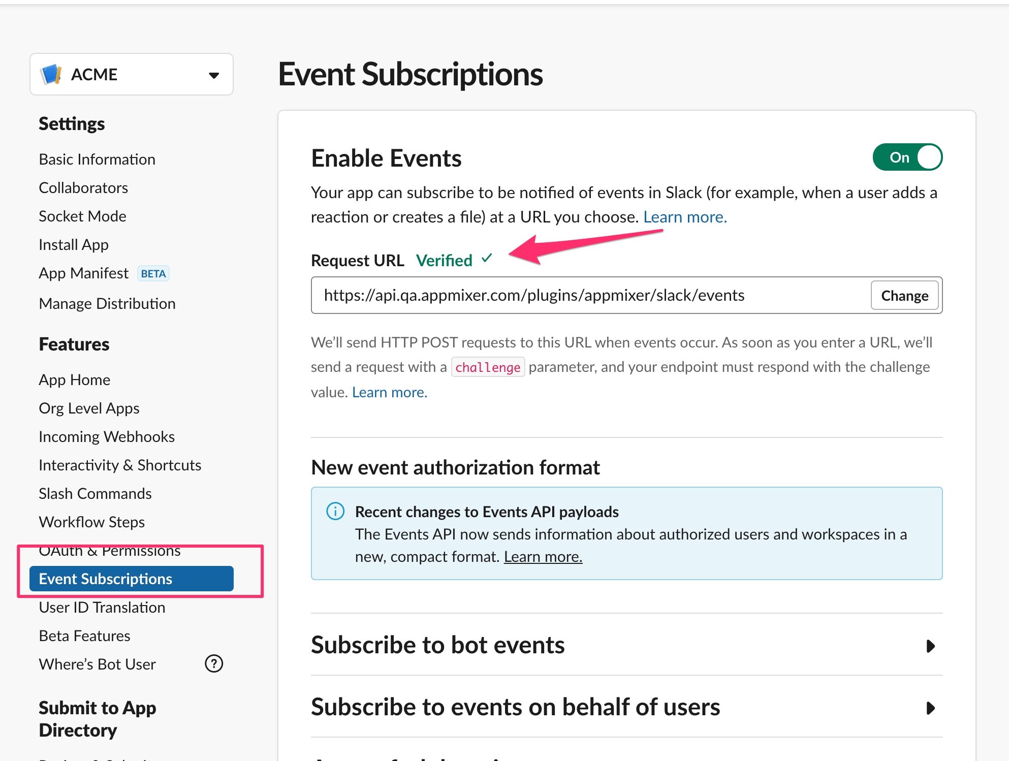The Request URL has to point to your Appmixer backend server. The rest of the URL /plugins/appmixer/slack/events