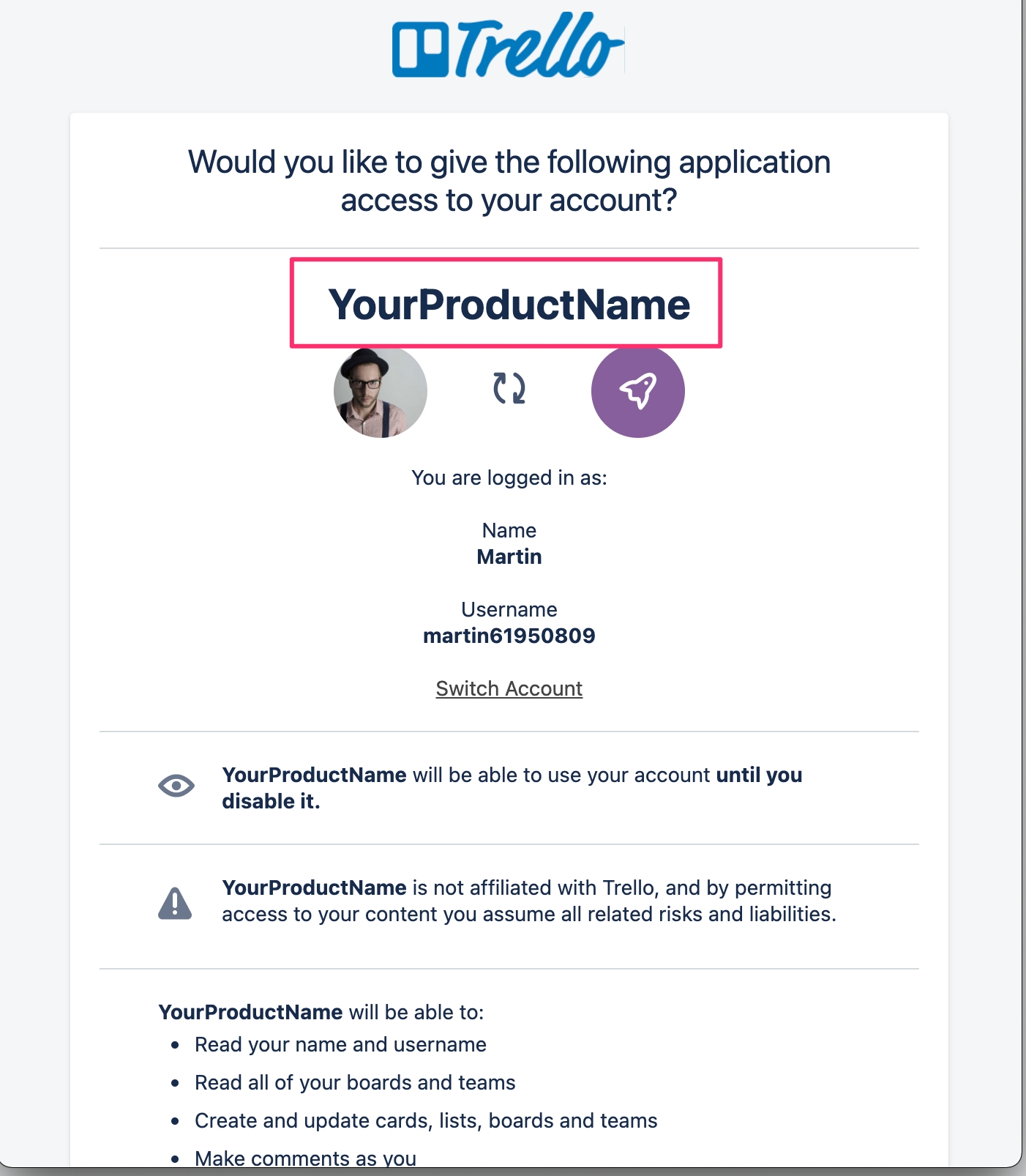 Since version 4.2.1 you can configure the string that appears on the Trallo Oauth page.