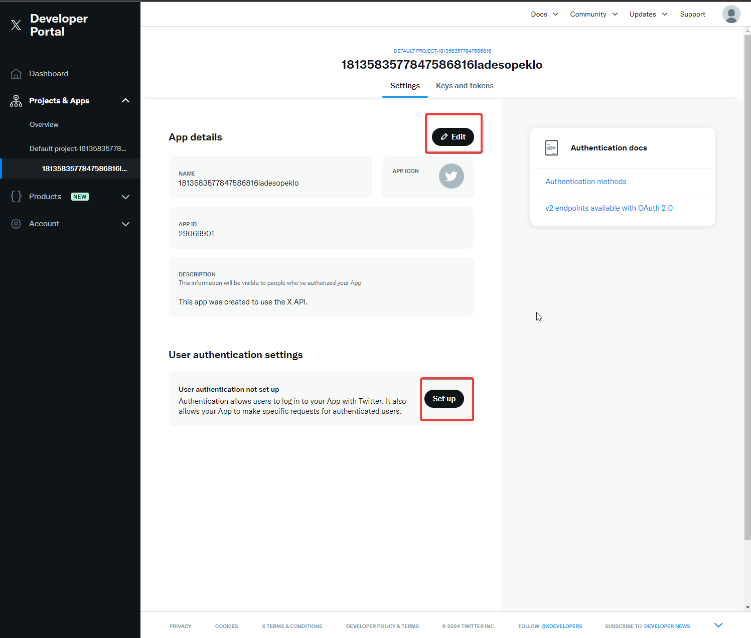 Update application details, such as the name, description, and icon, by clicking the "Edit" button. Next, configure the authentication settings.