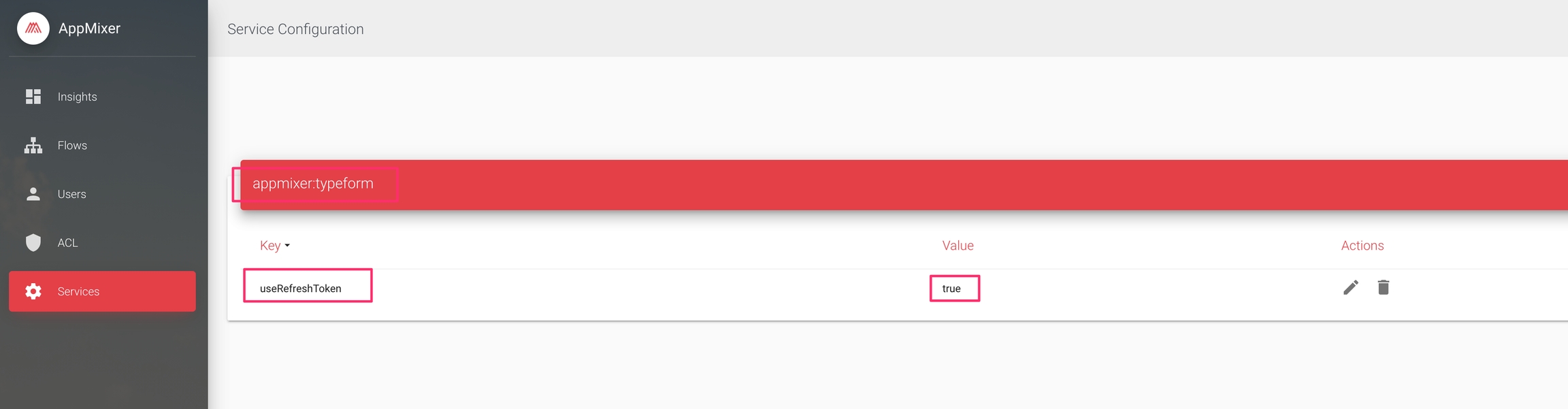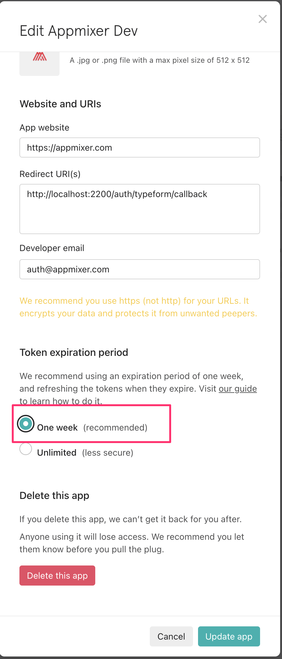 If you're registering the Oauth application for version 4.2 or newer, you can decide if you want to use tokens that do expire or not. If you decide to go with Unlimited then you don't have to set anything in the Backoffice, it is the default behavior. On the other hand, if you want to use tokens that expire, you have to go to the Backoffice and set the useRefreshToken to true for the appmixer:typeform service.