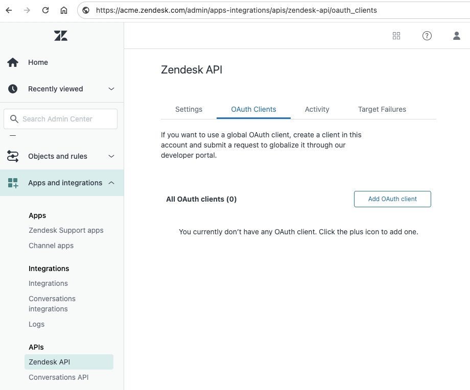 Now you need to add an OAuth application in Admin Center. In Admin Center navigate to: Apps and integrations > Connections > OAuth Clients.