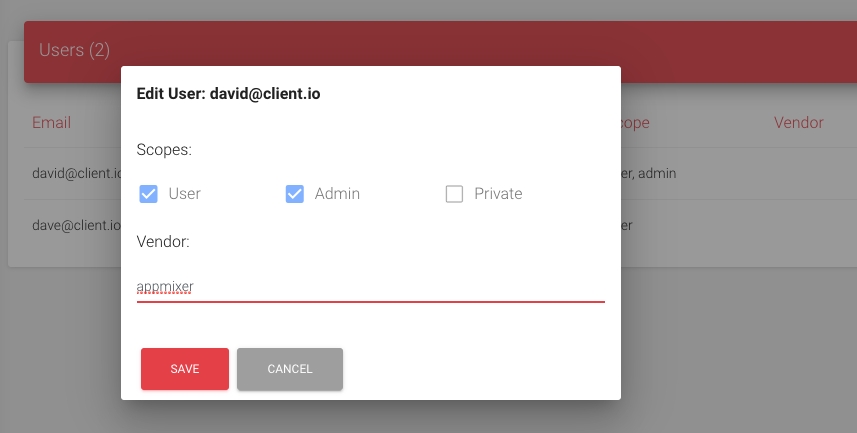 WriteResult({ "nMatched" : 1, "nUpserted" : 0, "nModified" : 1 })As you can see, we have set the "scope" property on our user record to ['user', 'admin']. From now on, our user will have admin rights. Now you can sign in to the Backoffice UI at http://localhost:8081 using the email address and password of your admin user. If you visit the Users page, you should see something like this: