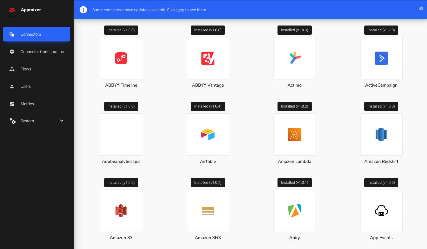 A standalone admin panel providing overview of all the flows and users in Appmixer together with system and modules configuration, ACL lists, system webhooks and more.
