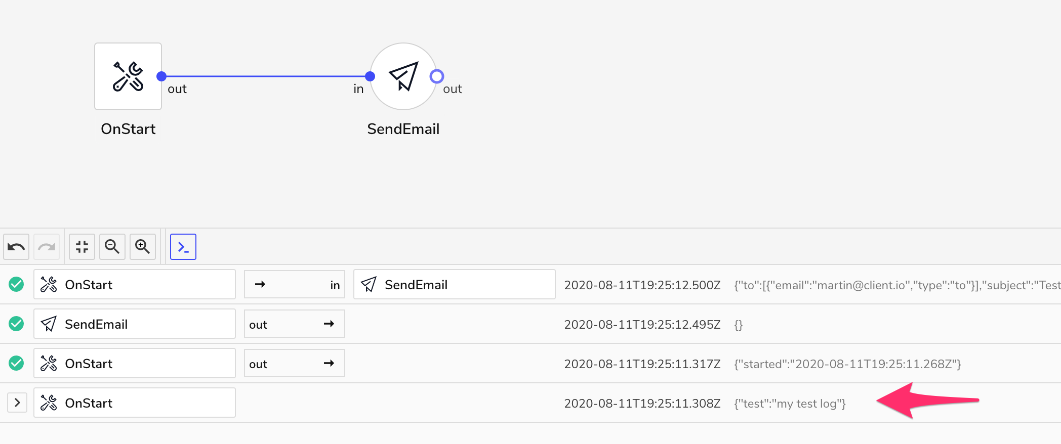 Log a message. The log message will be available to the end-users in the log panel of the Designer UI or in the Insights page of the Appmixer Studio. The argument has to be an object that can be stringified into JSON.