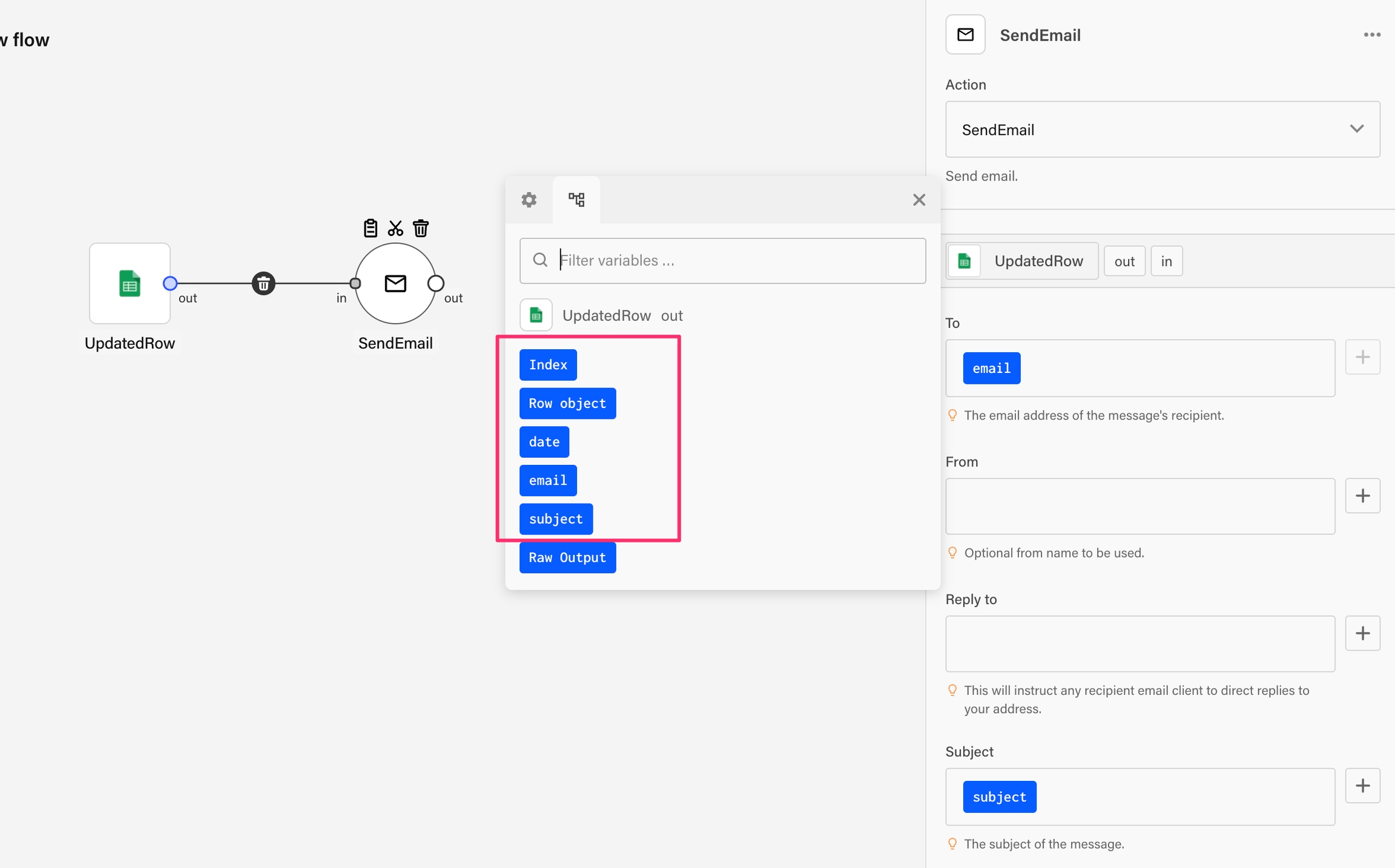And if you use the Each connector, you will see the item properties in the Variables picker.