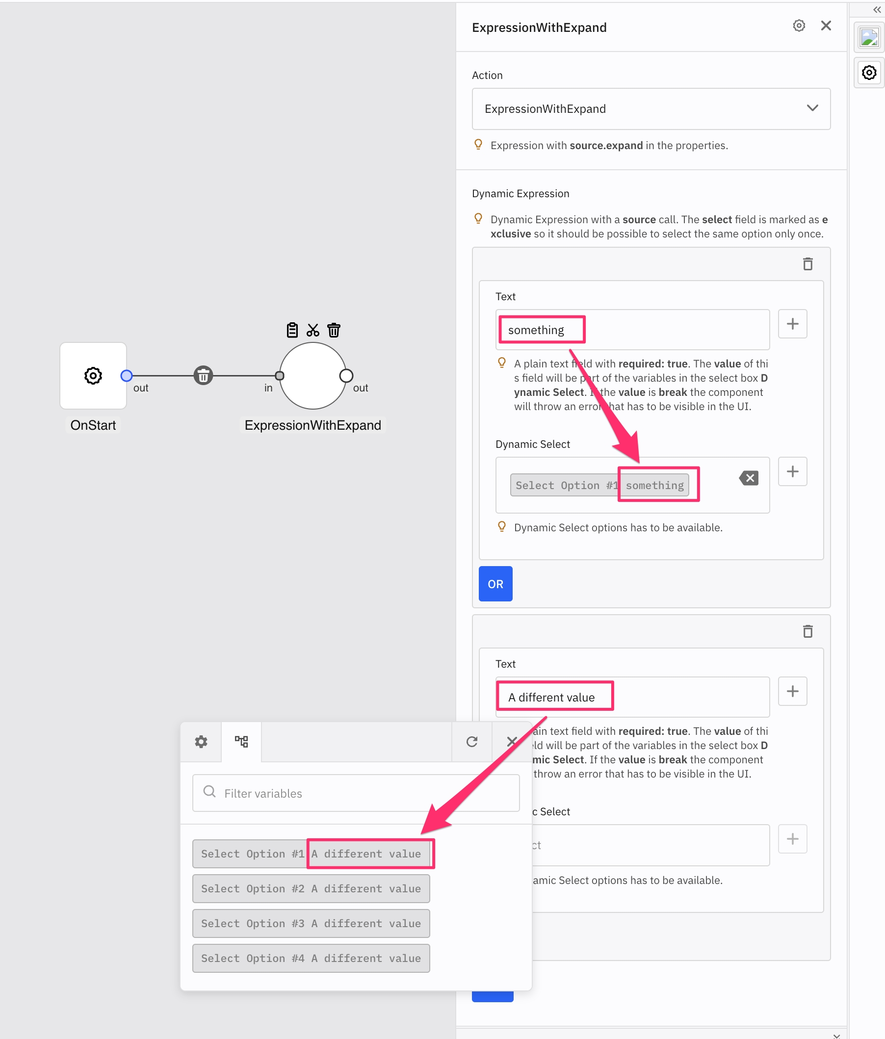 As it was mentioned, conditional fields also work with expression types, allowing to control the field rendering inside those expressions: