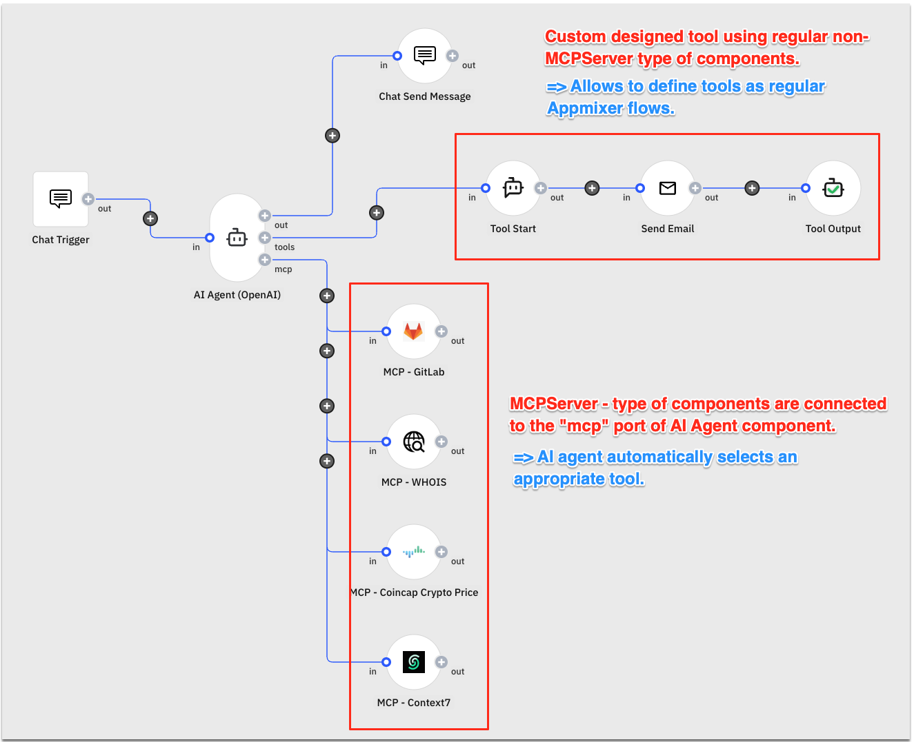 In Appmixer, MCP servers can only be connected to dedicated mcp ports of AI Agent components. This restriction ensures that AI Agents can communicate with MCP servers through a controlled and consistent interface.