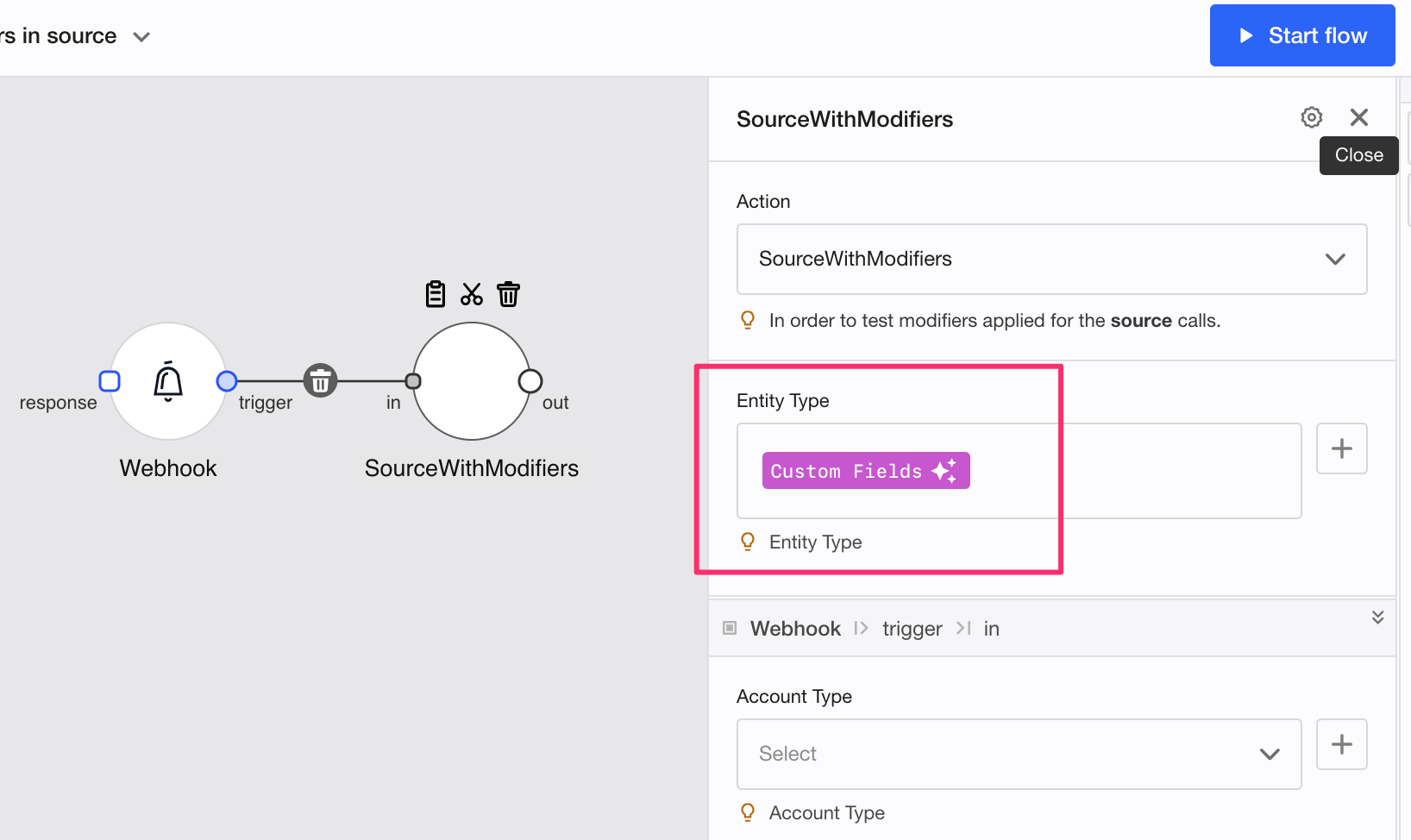 In this example, the *entityType* is taken from the flow’s custom fields (and a modifier JSONPath is applied to it). In the previous versions of Appmixer the value propagated to the source component (*SourceWithModifiers* in this case) was not resolved, i.e. the potential variables and modifiers applied to the propagated parameter where not correctly evaluated when they reached the source component (*SourceWithModifiers*).