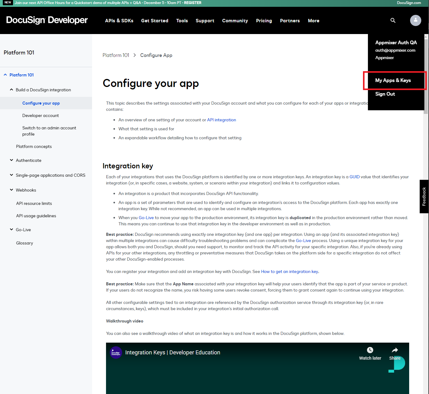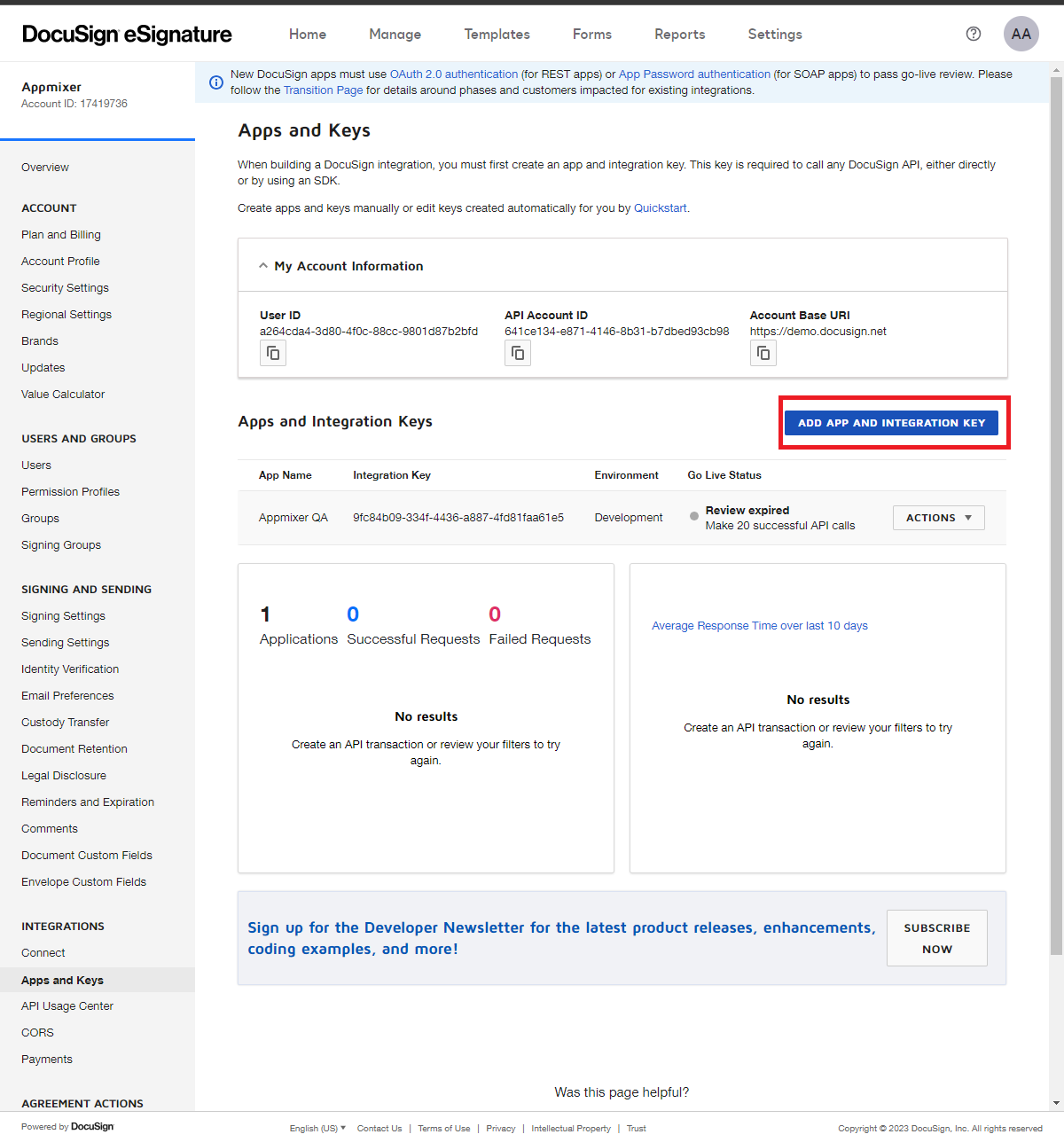 Go to the [Apps and Keys](https://admindemo.docusign.com/apps-and-keys) page (you can also get there from the [Docs](https://developers.docusign.com/platform/configure-app/))