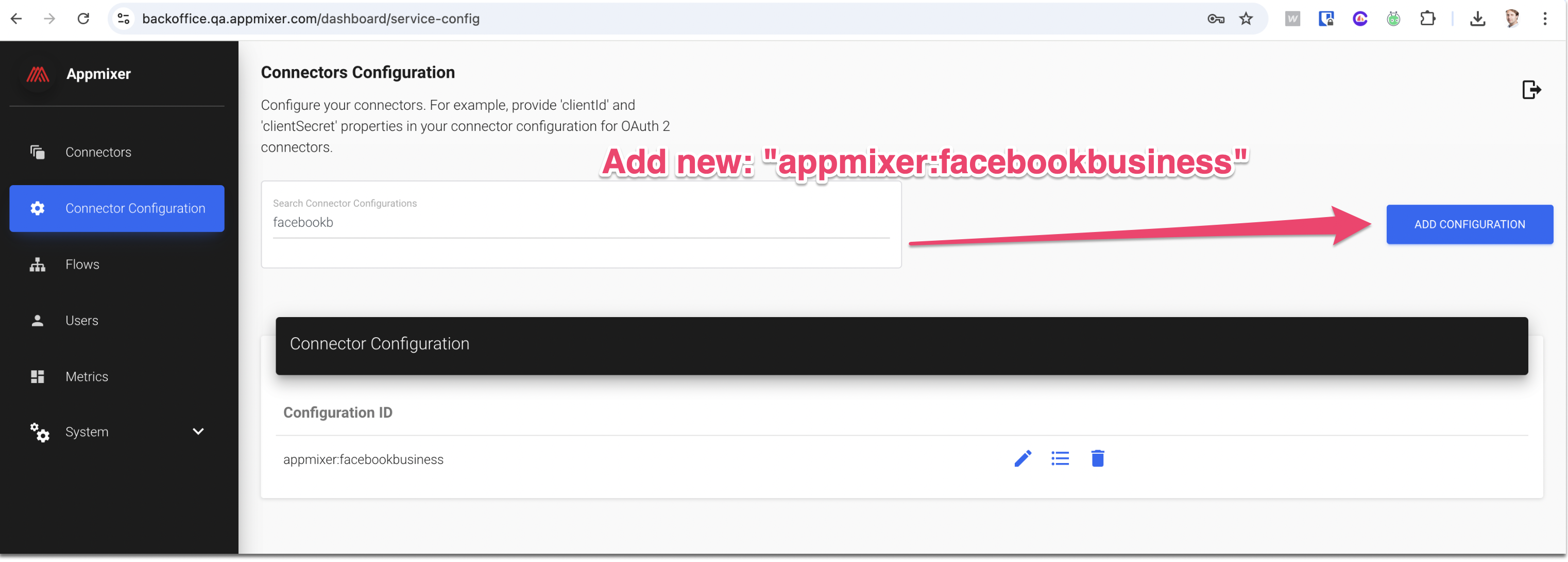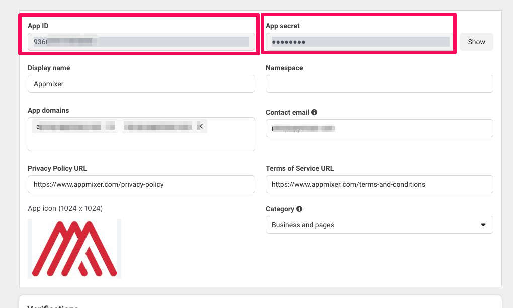 3. Copy the **App ID** and **App Secret** a and paste it to your **Appmixer Backoffice -> Connector Configuration** page under the `appmixer:facebookbusiness` configuration ID as `clientId` and `clientSecret`, respectively:\\
