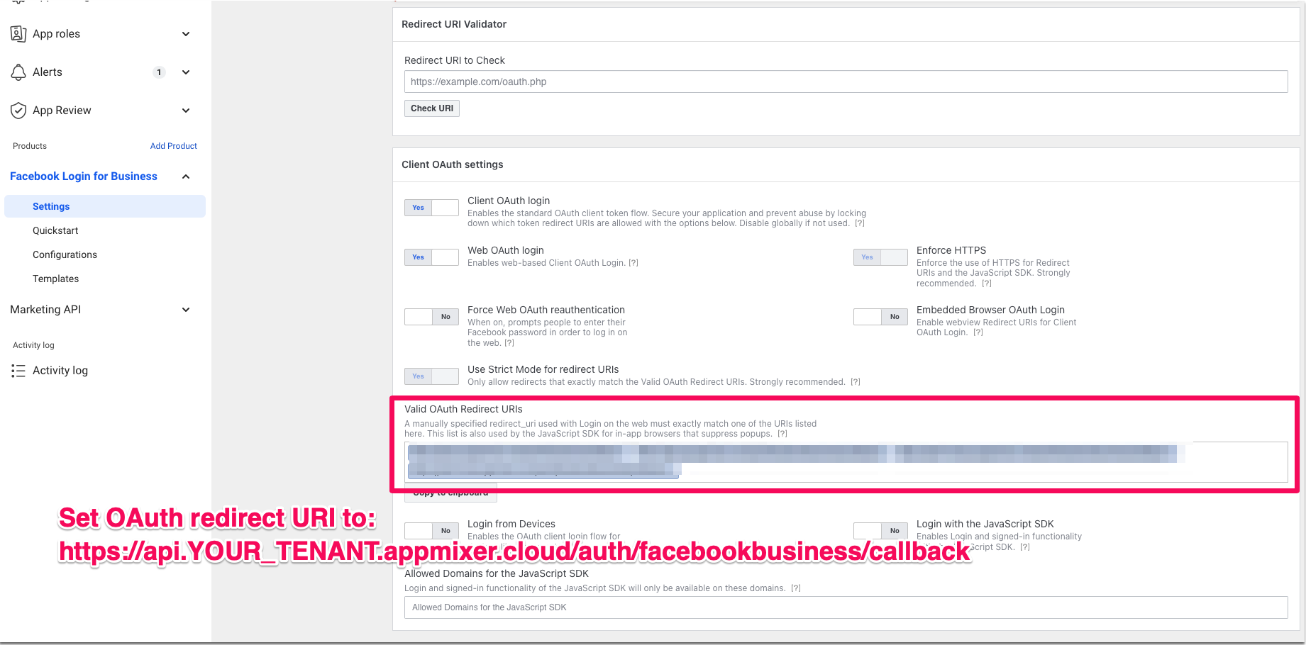 5. Set the OAuth redirect URI under **Facebook Login for Business** / **Settings** to `https://api.YOUR_TENANT.appmixer.cloud/auth/facebookbusiness/callback`:\\