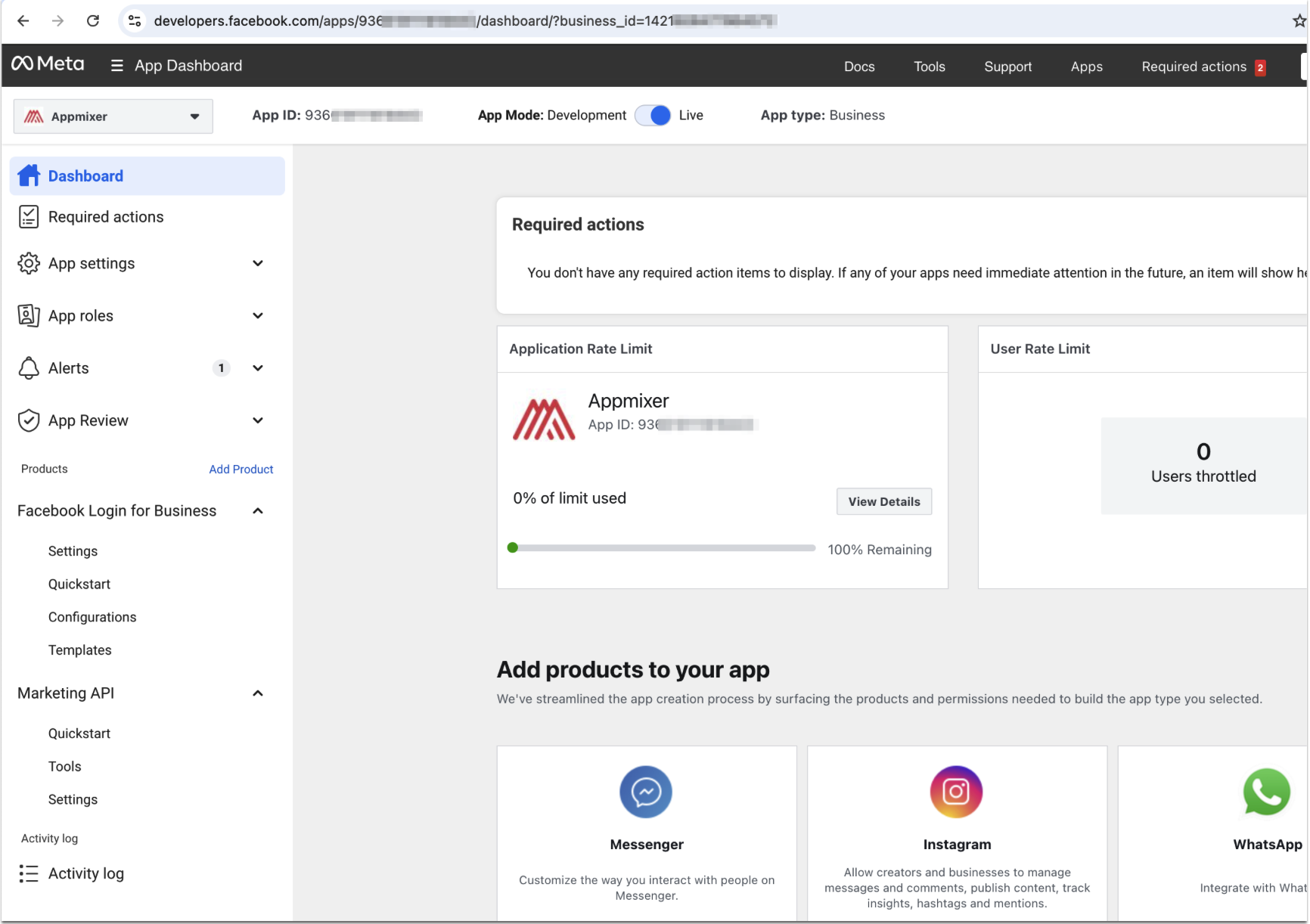 2. Add **Facebook Login for Business** and **Marketing API** products.\\