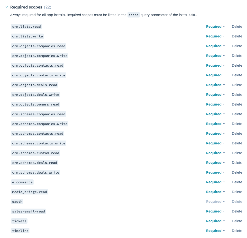 Go back to Hubspot and set the redirect URL, replace *acme.com* with your domain and keep the suffix /auth/hubspot/callback