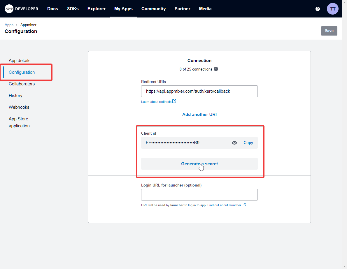Get you *client ID* and *clientSecret* in the "Configuration" section