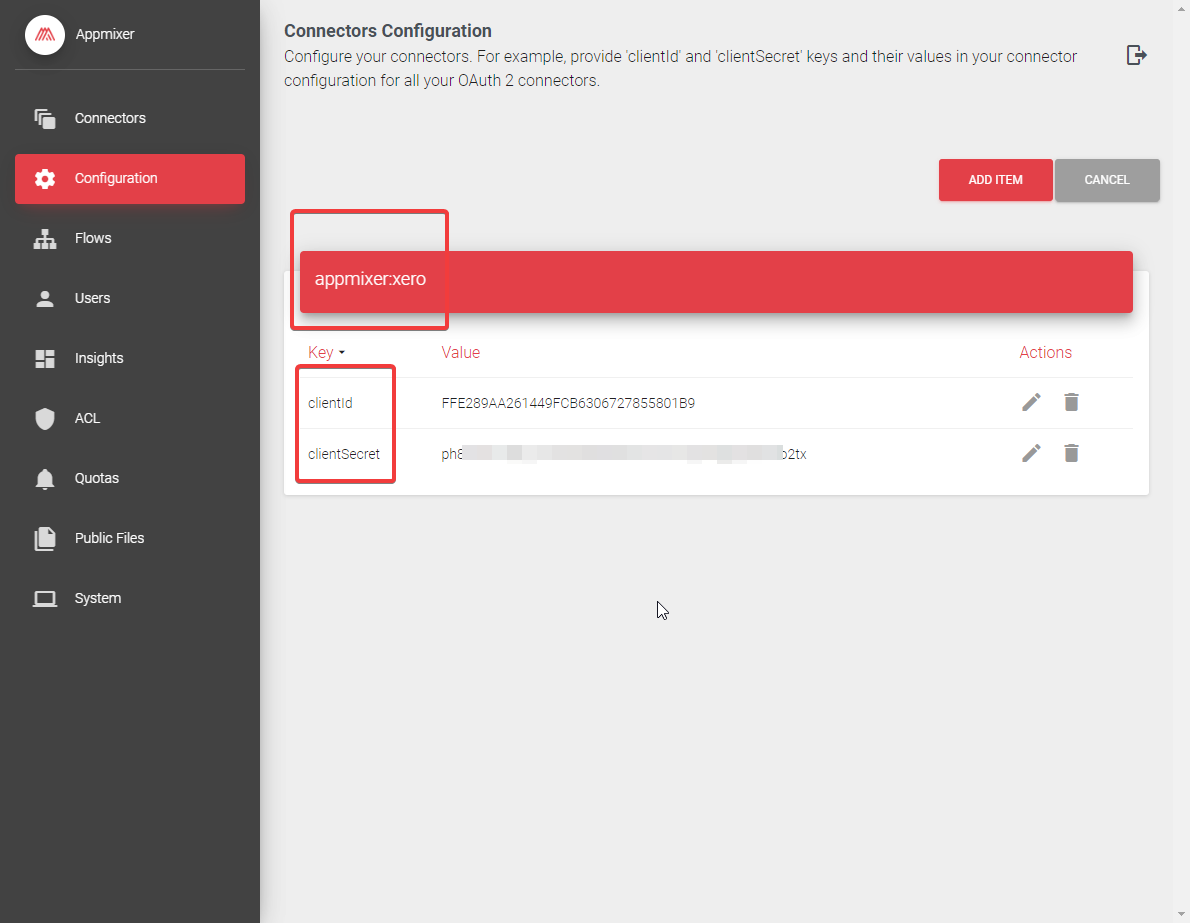 Go to the Appmixer BackOffice -> Configuration. Add new configuration: `appmixer:xero` . Add your `clientId` and `clientSecret` keys.