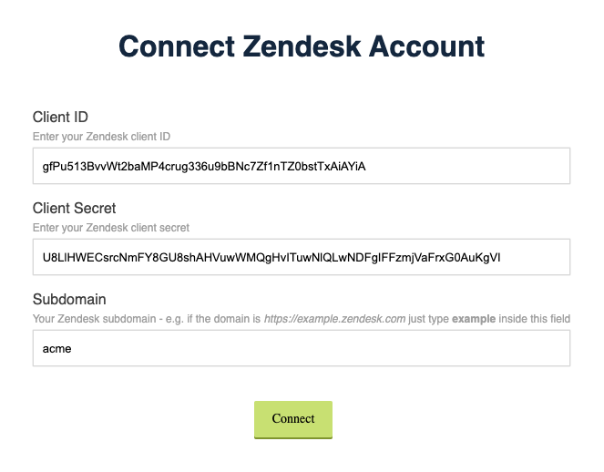 Note that the `subdomain` is the first part of your Zendesk URL. For example, if your Zendesk URL is `https://mycompany.zendesk.com`, then your subdomain is `mycompany`. In our example, the subdomain is `acme`.