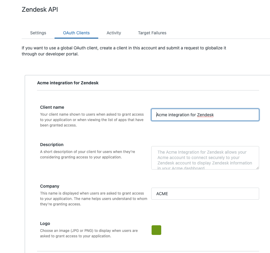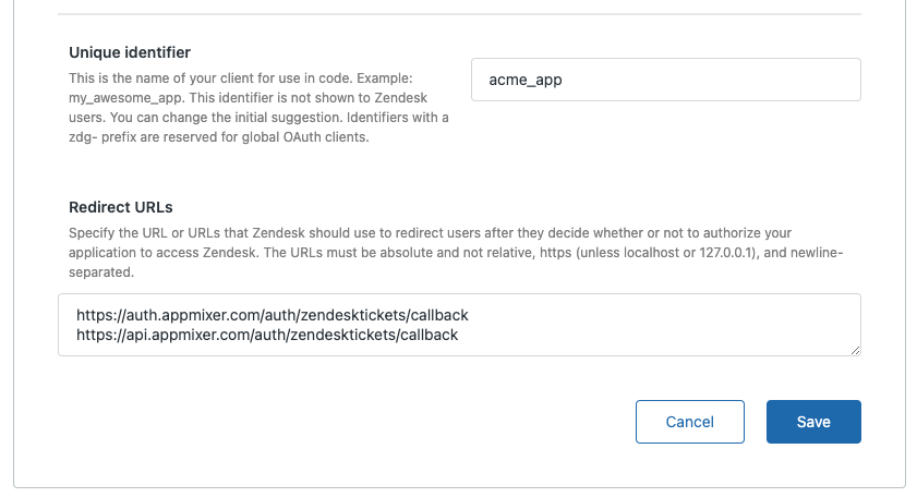<figure><img src="https://802996127-files.gitbook.io/~/files/v0/b/gitbook-x-prod.appspot.com/o/spaces%2FIAGKHlIqVKJe9agnFr14%2Fuploads%2Fgit-blob-a7ebf929240310f17871920a1bb161fb078bc629%2Fzendesk-tickets-4.png?alt=media" alt=""><figcaption><p>Specify unique client ID and redirect URLs</p></figcaption></figure>
