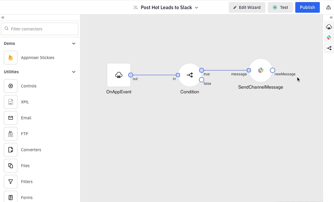Configure the Condition component to check whether the hotLead property from the OnAppEvent trigger is set to true. Use the "+" button next to any configuration field. This feature allows you to reference data from any component earlier in the integration flow (data variables), regardless of its depth in the workflow.