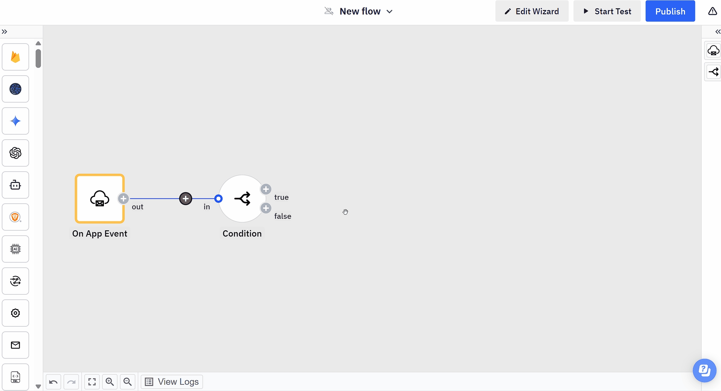 Next, add the Condition component to your flow. Do this by clicking Add Step on the right side of the On App Event component. Then type in "condition" and select it.