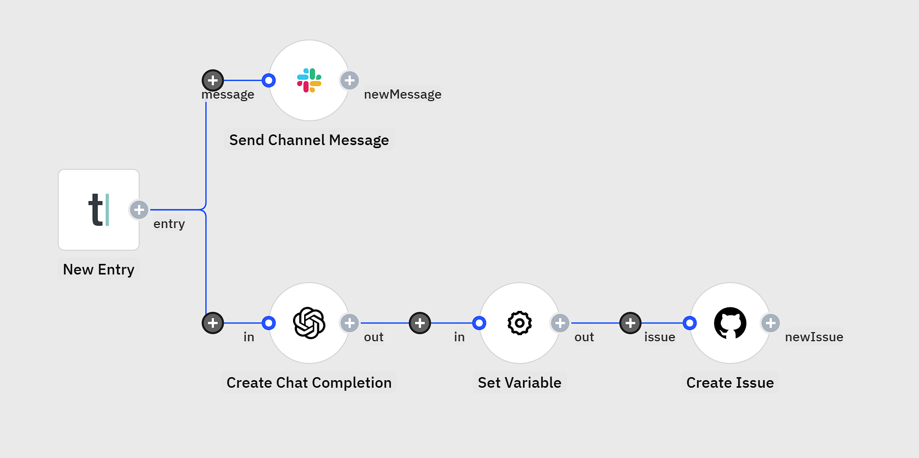 In this tutorial, we'll construct an automation designed to gather customer feedback via Typeform, relay each piece of feedback as a Slack notification, and automatically generate a GitHub issue based on the customer's response to the question: "What improvements or additional features would you like to see in future updates?". Utilizing OpenAI's ChatGPT, the generated ticket will be structured as a comprehensive user story, encompassing title, role, goal, reason, acceptance criteria, and test case.&#x20;