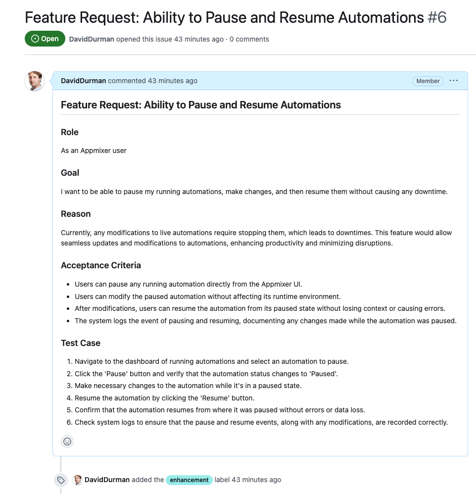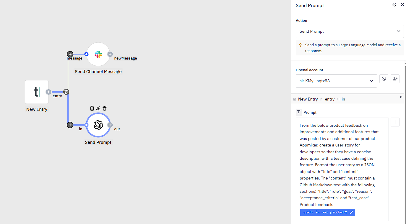 You can copy paste the prompt from here: `From the below product feedback on improvements and additional features that was posted by a customer of our product Appmixer, create a user story for developers so that they have a concise description with a test case defining the feature. Format the user story as a JSON object with "title" and "content" properties. The "content" must contain a Github Markdown text with the following sections: "title", "role", "goal", "reason", "acceptance_criteria" and "test_case". Product feedback: <map your data variable from the form here>`