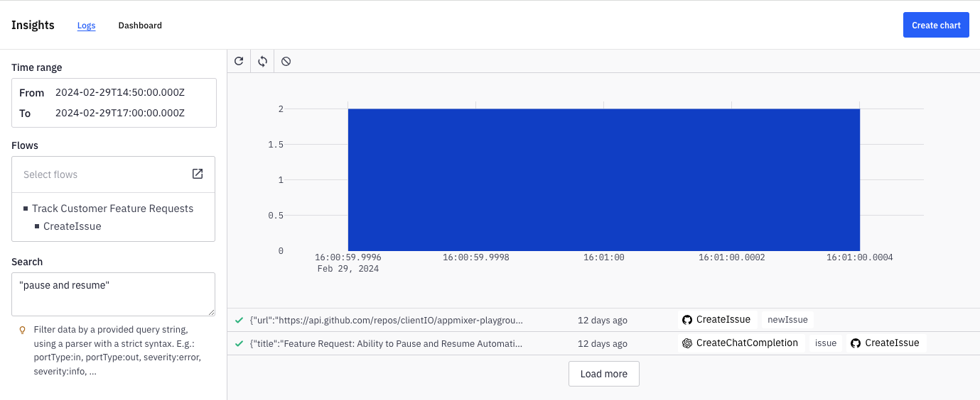Additionally, you can visit the Insights page to access enhanced filtering options and gain improved visibility into your logs. For instance, if you're specifically interested in logs pertaining to the CreateIssue component, you can utilize the Flows selector in the left panel. This allows you to select and view logs exclusively for the component of interest.