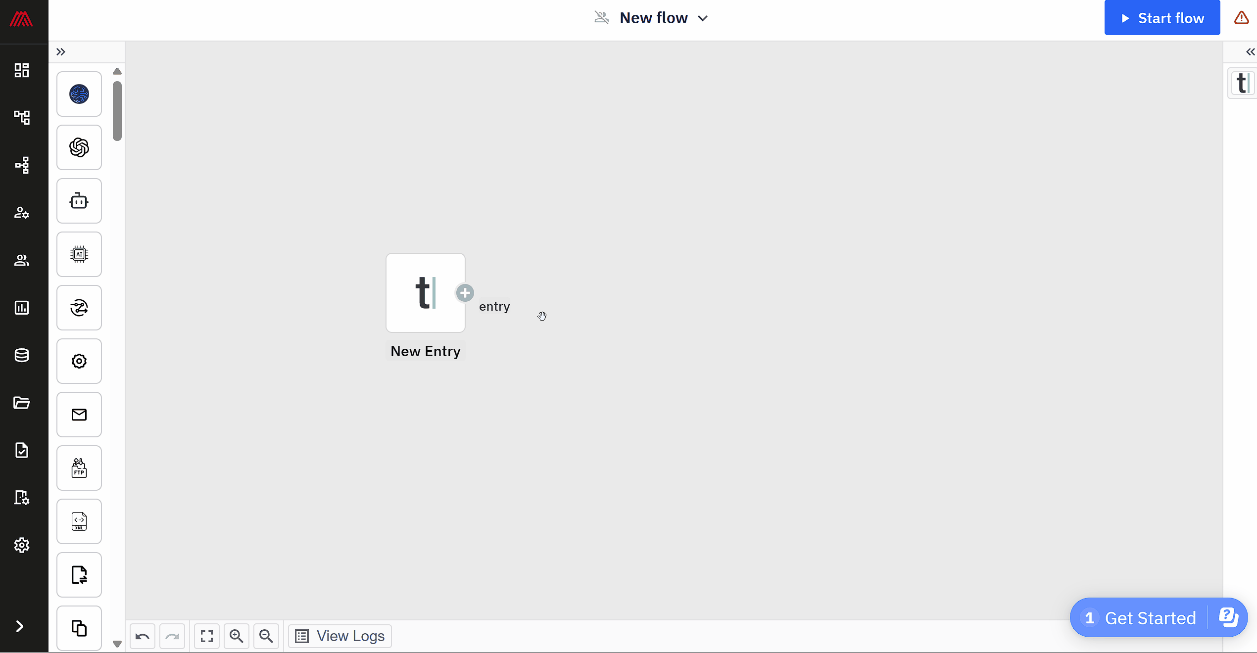 Your automation is now set up and ready to be launched. Begin by giving it a distinctive name; this can be done by double-clicking on the default "New flow" title and renaming it to something more descriptive, like "Track Customer Feature Requests". To activate your automation, click the "Start flow" button located in the top right corner. You'll notice the log panel opens at the bottom displaying the initial log entry: "Flow started". As customer feedback starts coming in through our Typeform web form, the log panel will populate with entries detailing the actions taken within the flow. These logs provide insights into each component's input, the data transmitted between components, and the output generated, offering a comprehensive view of the automation's operation: