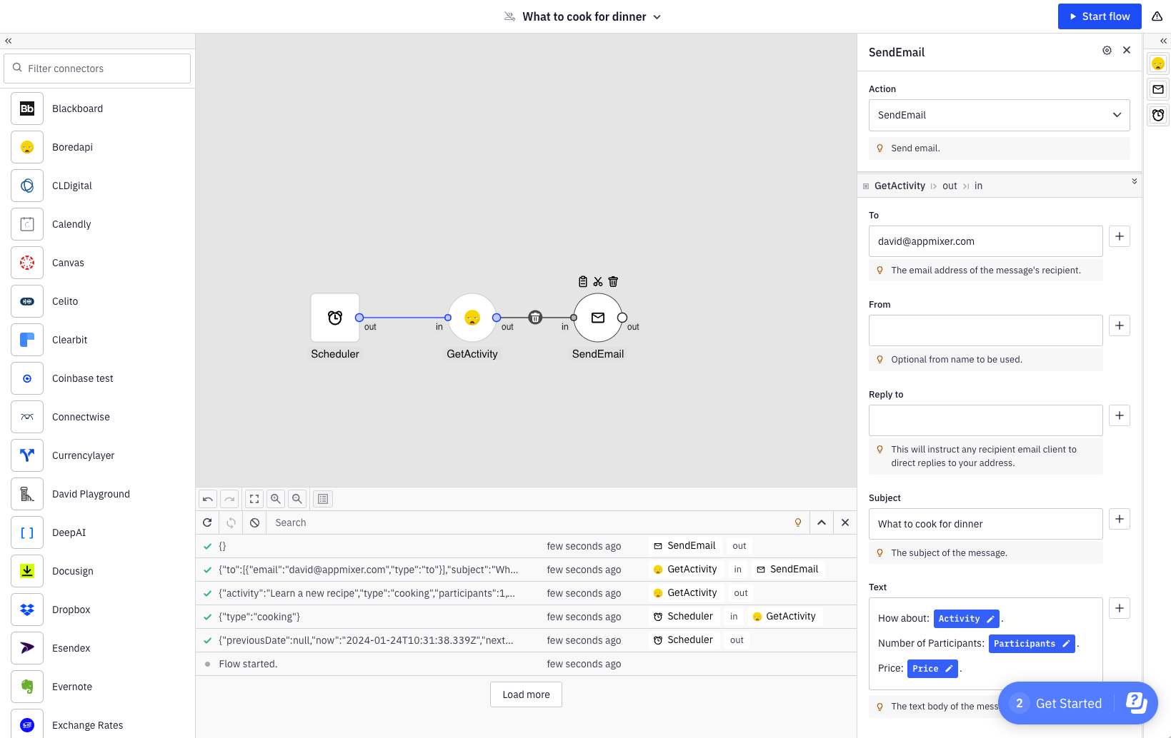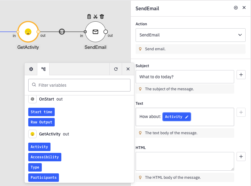 <figure><img src="https://content.gitbook.com/content/gA9J5A1N66u2GrNSZK7X/blobs/G8ITf4Za4UmkrLAmr9gh/image.png" alt=""><figcaption><p>Output of GetActivity consumed in the connected SendEmail component</p></figcaption></figure>