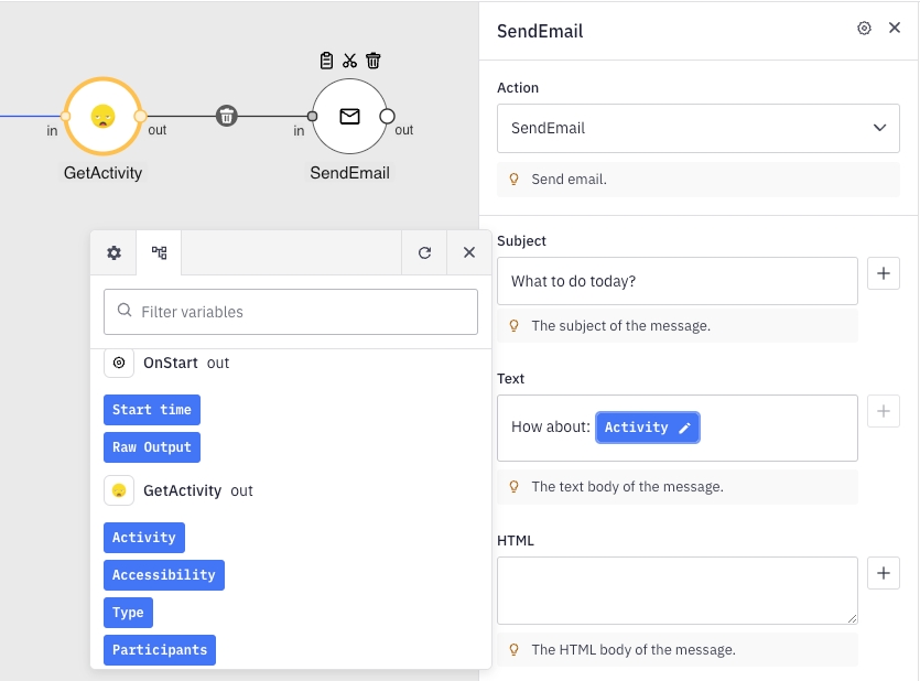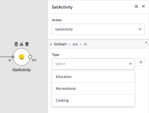 Our component will feature one input port, allowing it to connect with other components within your automations and integrations. It will also have one output port for linking to subsequent actions that might utilize the data from our GetActivity component. Additionally, our component will offer an option for users to specify the type of activity they wish to receive—be it "education," "recreational," or "cooking."