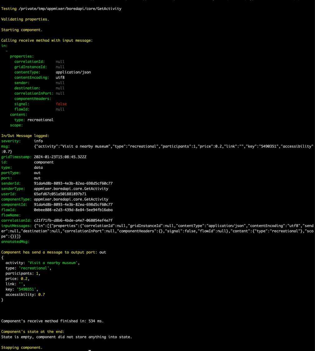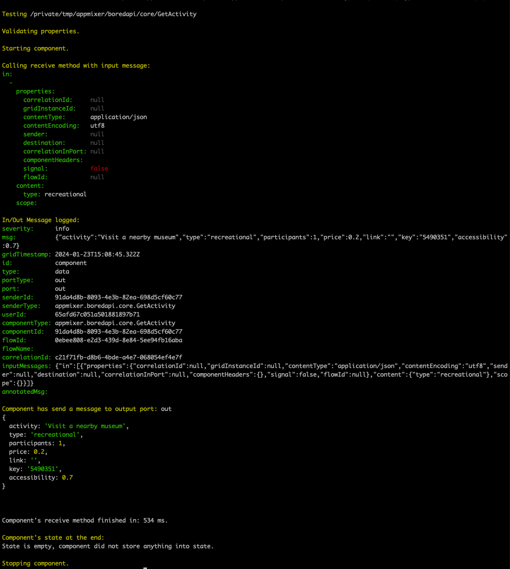 $ appmixer test component appmixer/boredapi/core/GetActivity \