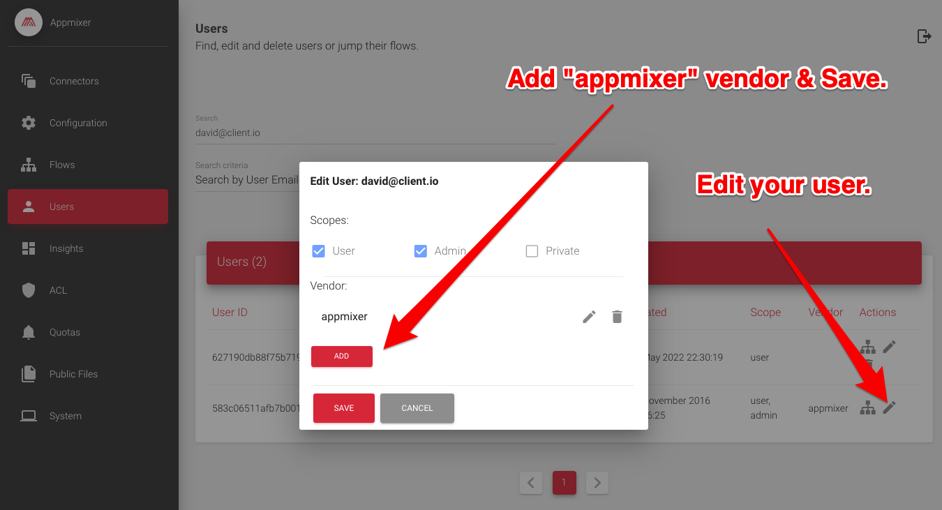 Now, you need to initialize the CLI tool to configure it for your Appmixer tenant and log in with an admin account. Before you publish your components, verify that your admin account is [associated with a "vendor."](https://docs.appmixer.com/appmixer-cli/appmixer-cli#publish-your-component) To do this, visit your Appmixer tenant's backoffice at `https://backoffice.[YOURTENANT].appmixer.cloud`. Navigate to the Users page, locate your user account, edit it, and add "appmixer" as the vendor. Without having the vendor assigned, you will not be able to publish components to your Appmixer tenant.<br>