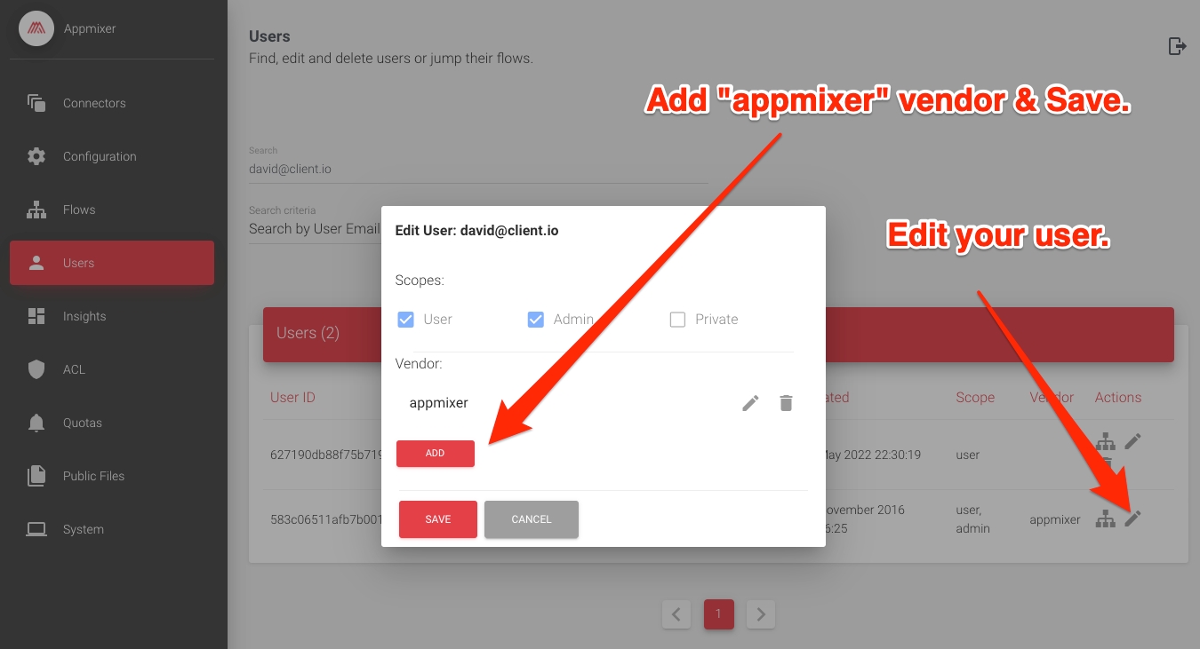 . Navigate to the Users page, locate your user account, edit it, and add "appmixer" as the vendor. Without having the vendor assigned, you will not be able to publish components to your Appmixer tenant.