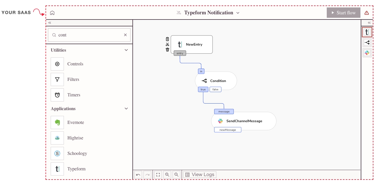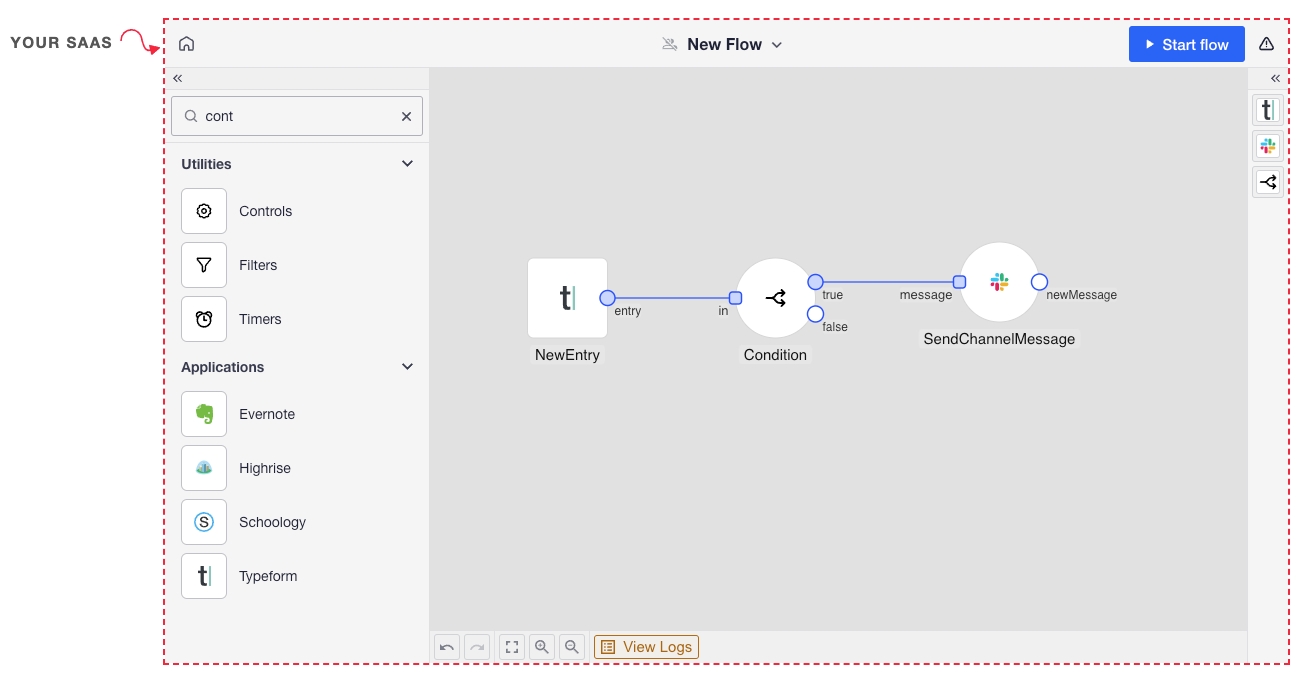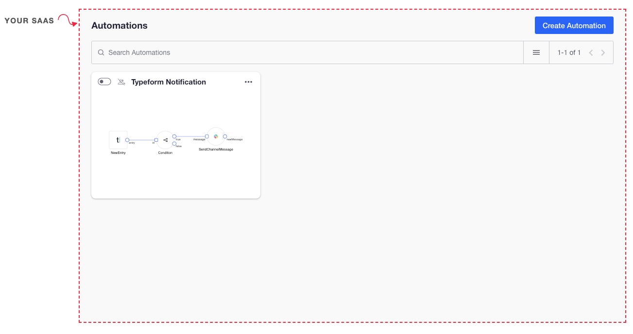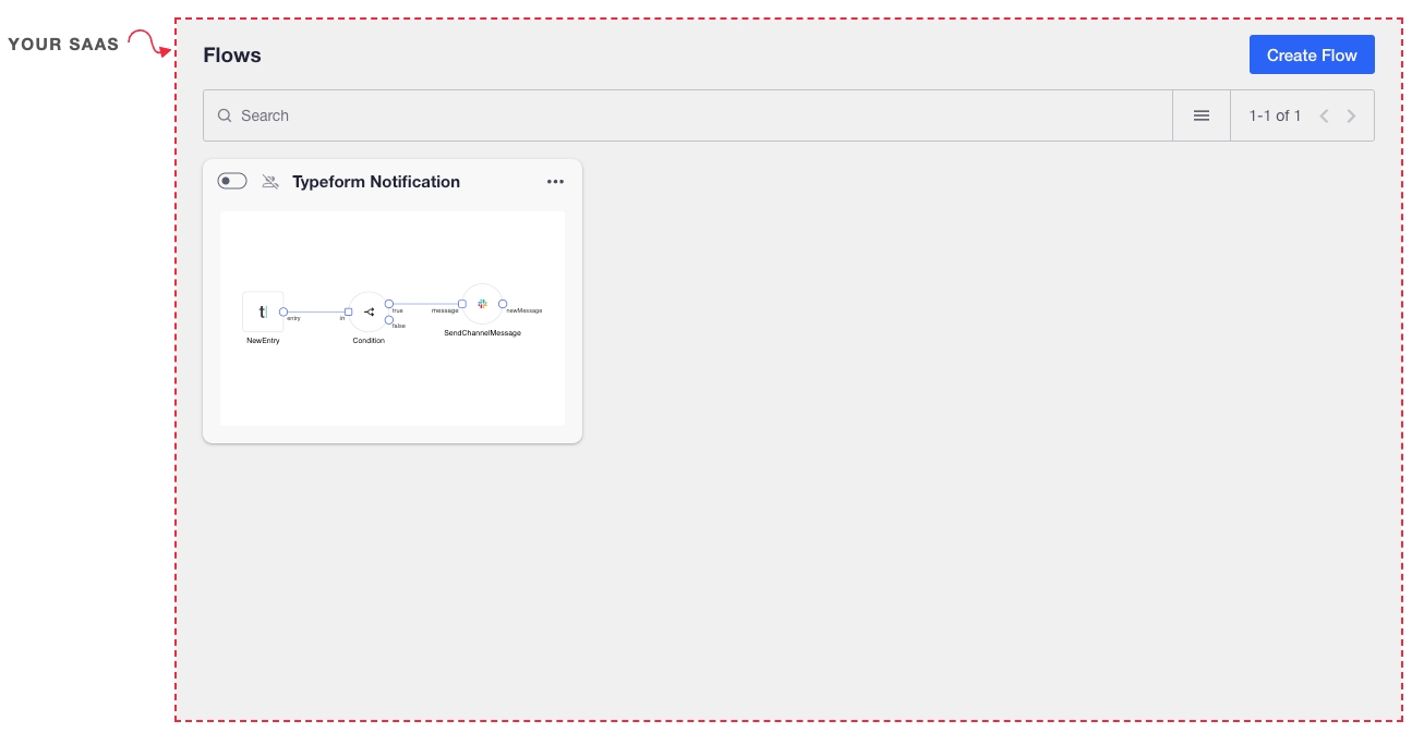 Embedding the Integration Marketplace into your application is just the beginning. You can also incorporate the fully-featured drag-and-drop Automation Designer, granting your end-users unparalleled flexibility in integration and automation. Typically, when integrating the ui.Designer, it's beneficial to include the ui.FlowManager as well. This UI widget presents a list of automations previously created by your users, complete with capabilities for filtering, searching, and managing these automations.