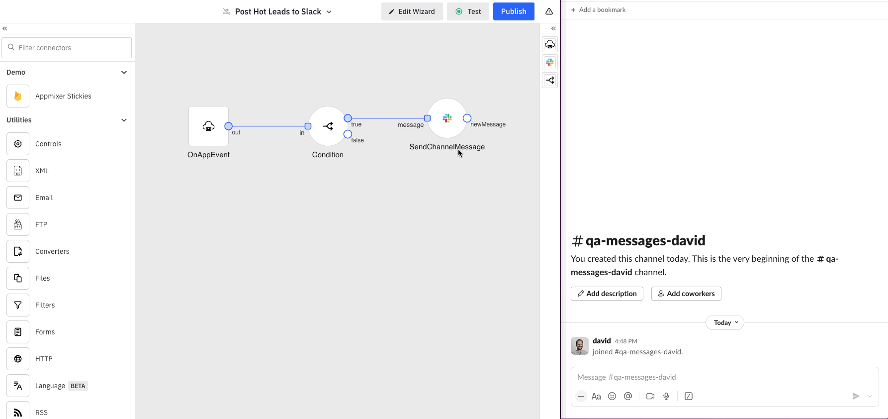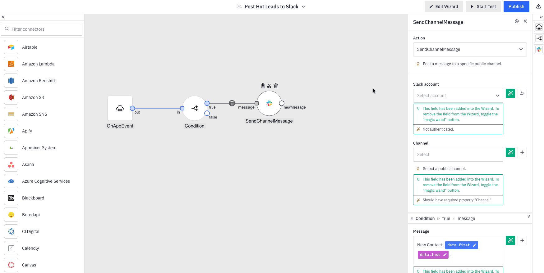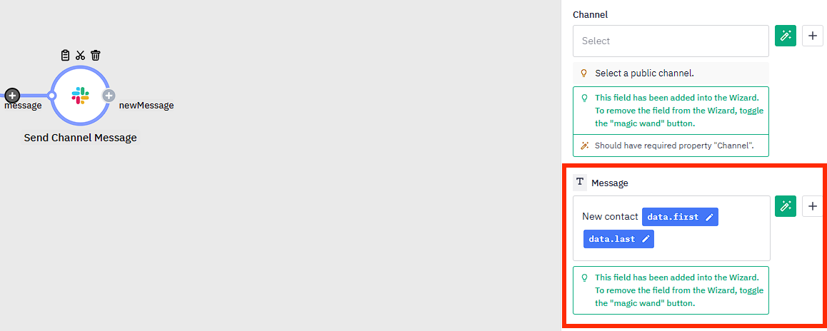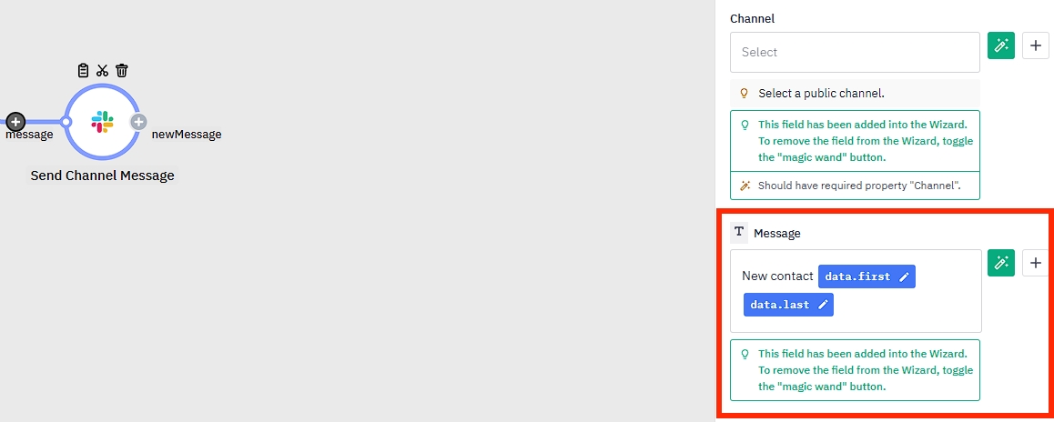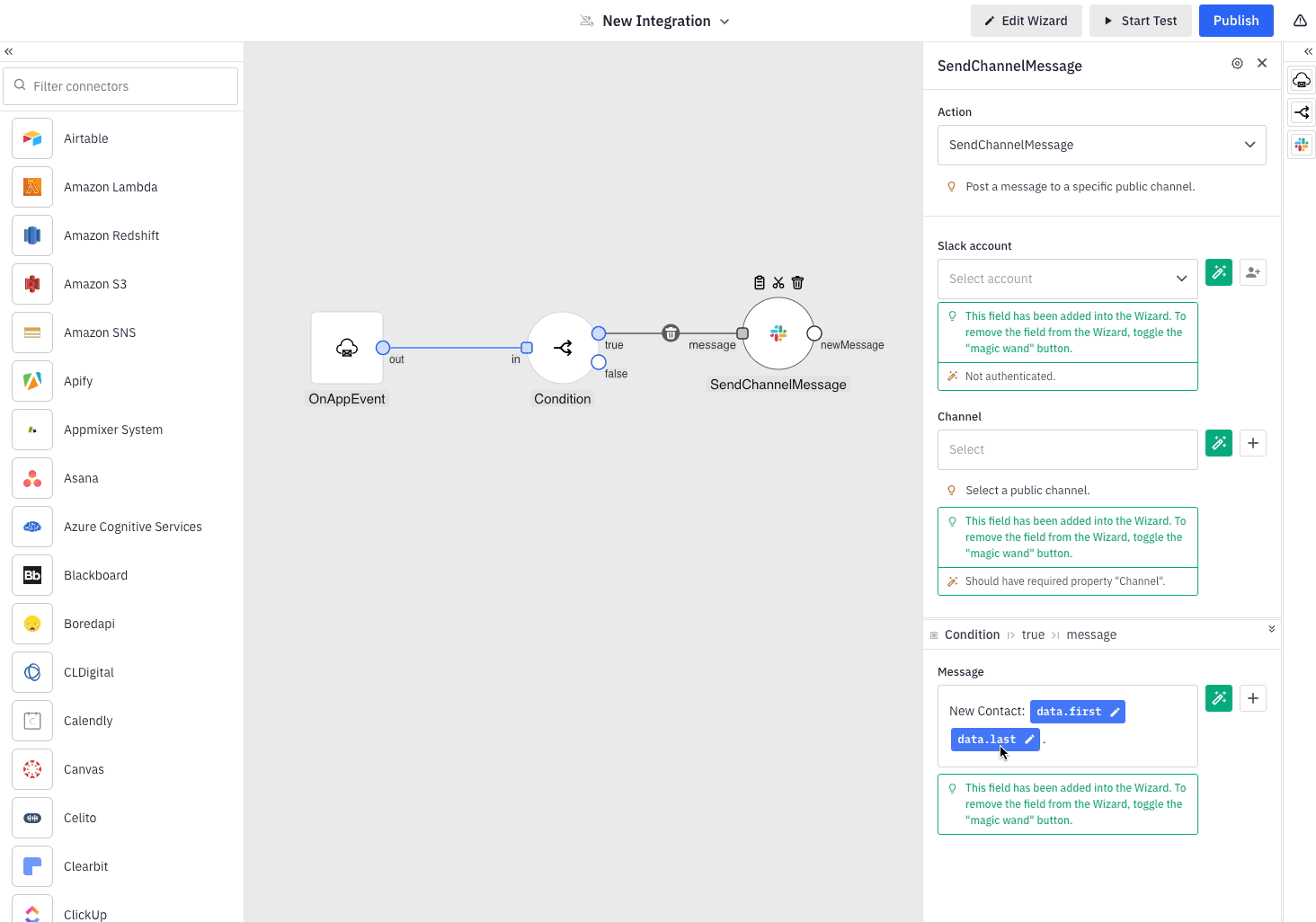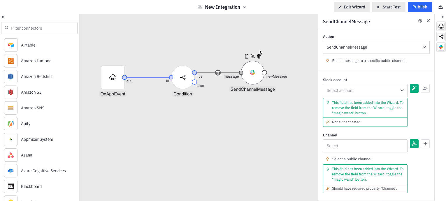 At this point, our integration is prepared for publishing. However, it is important to test it to see that it works as expected. Initially, we should examine the appearance of the final configuration web form (Wizard) as it will be presented to our end-users. Additionally, for improved clarity, we recommend renaming the default "Channel" and "Message" fields within the wizard to "Slack Channel" and "Slack Message," respectively. To do this, click on the "Edit Wizard" button located at the top of the interface. This will allow you to view a live preview of the wizard and make adjustments to the fields via the left navigation panel.