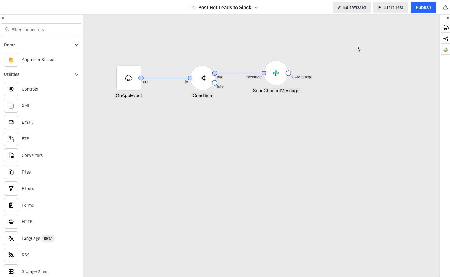 In our tutorial, we will demonstrate an integration that processes newly created contacts as external events. This simulates a real-world scenario where you would send these events via HTTP requests from your application code. The integration examines each contact for the presence of a `hotLead` parameter. If this parameter is set to `true`, the contact is then forwarded to Slack.<br>