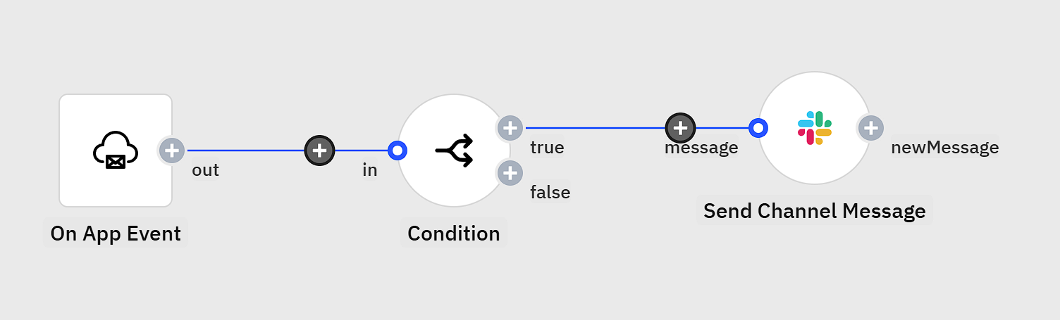 Next, click `Add Step` on the `true` output port of the `Condition` step. Then, find the `Slack - Send Channel Message` component: