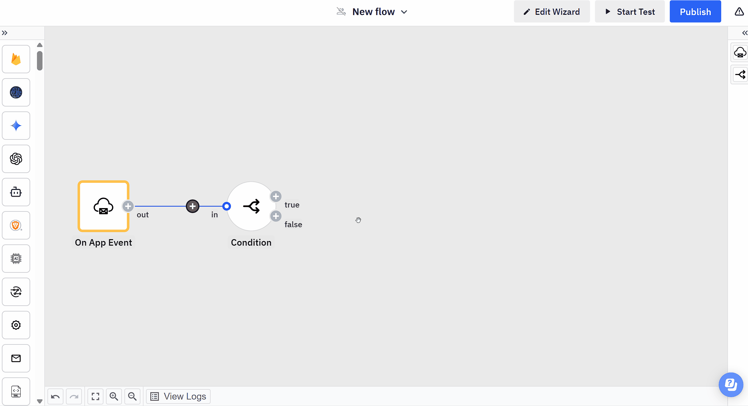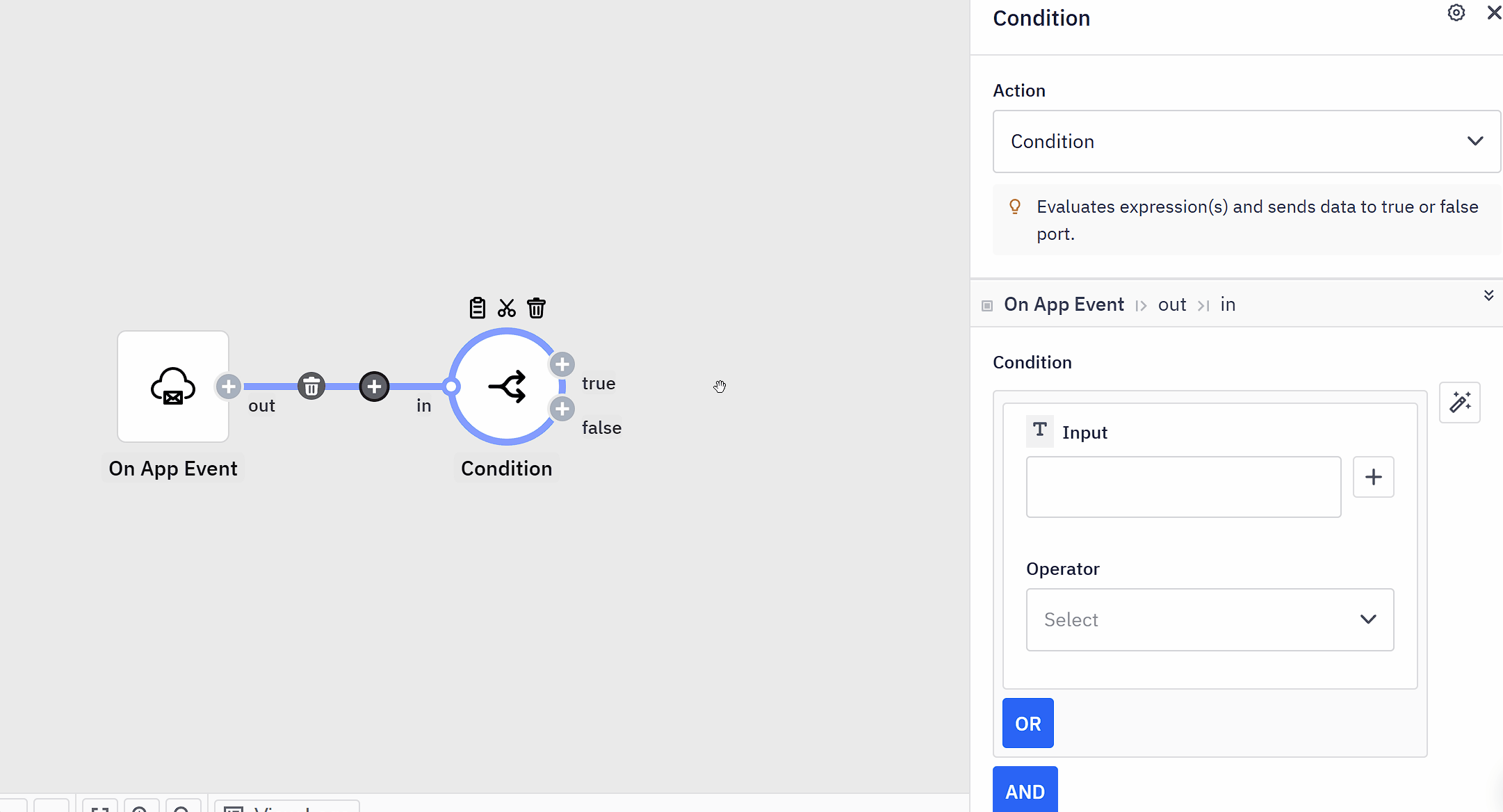 Next, add the `Condition` component to your flow. Do this by clicking `Add Step` on the right side of the `On App Event` component. Then type in "condition" and select it.