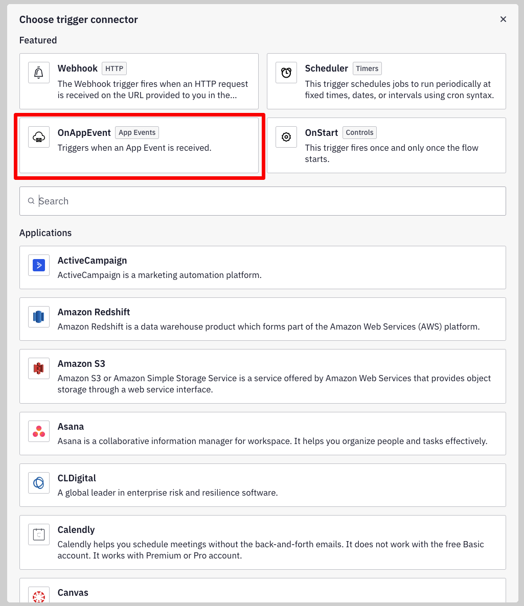 On the Integrations page, click the "*Create Integration*" button located in the top right corner. Then, select the `OnAppEvent` trigger from the Trigger selector. Utilizing [App Events](https://docs.appmixer.com/getting-started/use-app-events) represents the simplest method for sending data to Appmixer.