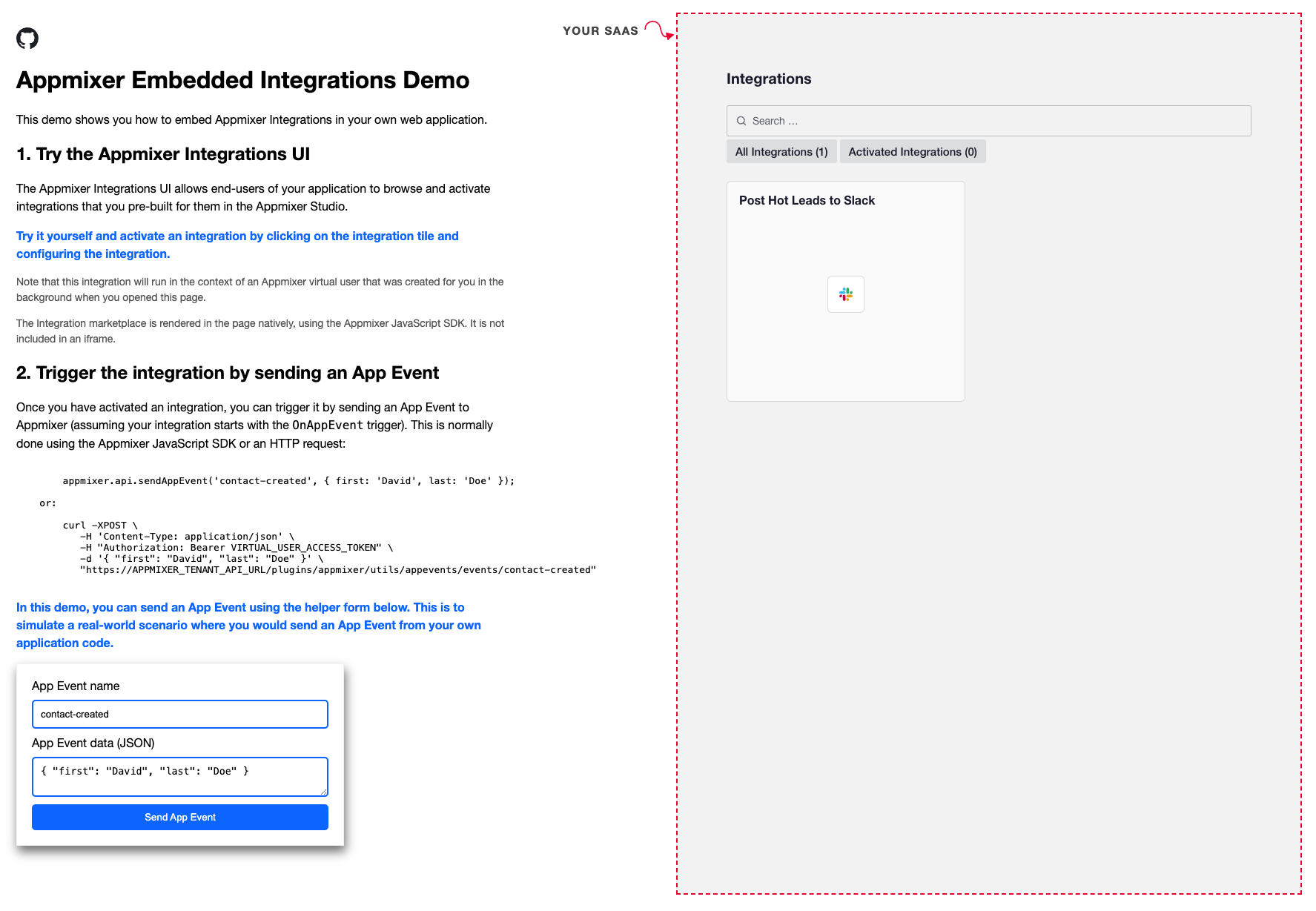 * Alternatively, go to our demo web app, which also allows you to preview how your embedded integration marketplace will appear in your app once the actual embedding is completed.